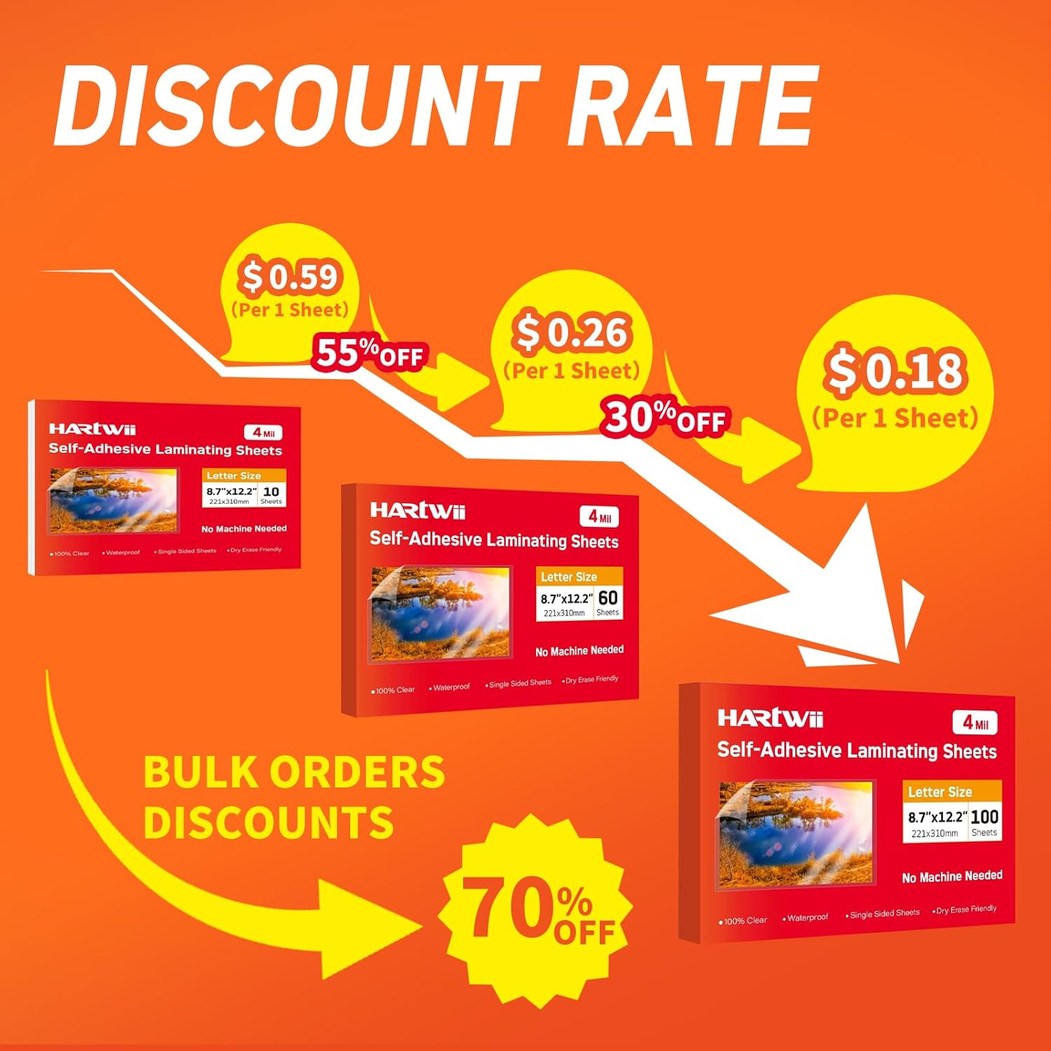 - UNIVERSAL DIMENSIONS:Hartwii Self-adhesive laminating sheets 8.7x12.2 inches ,4mil thickness ,10 pack of self sealing laminating sheets for you test ,it suitable for laminating 8.5x11 inches ,or smaller photos ,cards,labels,and stickers ,Single Side laminating film ,you can use two single-sided self laminating sheets us lamiate both front and back of a letter size paper