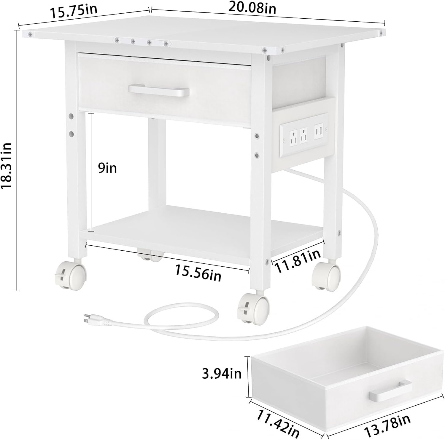 Lerliuo Under Desk Rolling Printer Stand with Charging Station and USB Ports, 2-Tier Printer Table Desk with Fabric Drawer, Printer Cart Holder with Lockable Wheels for Home, Office (White)