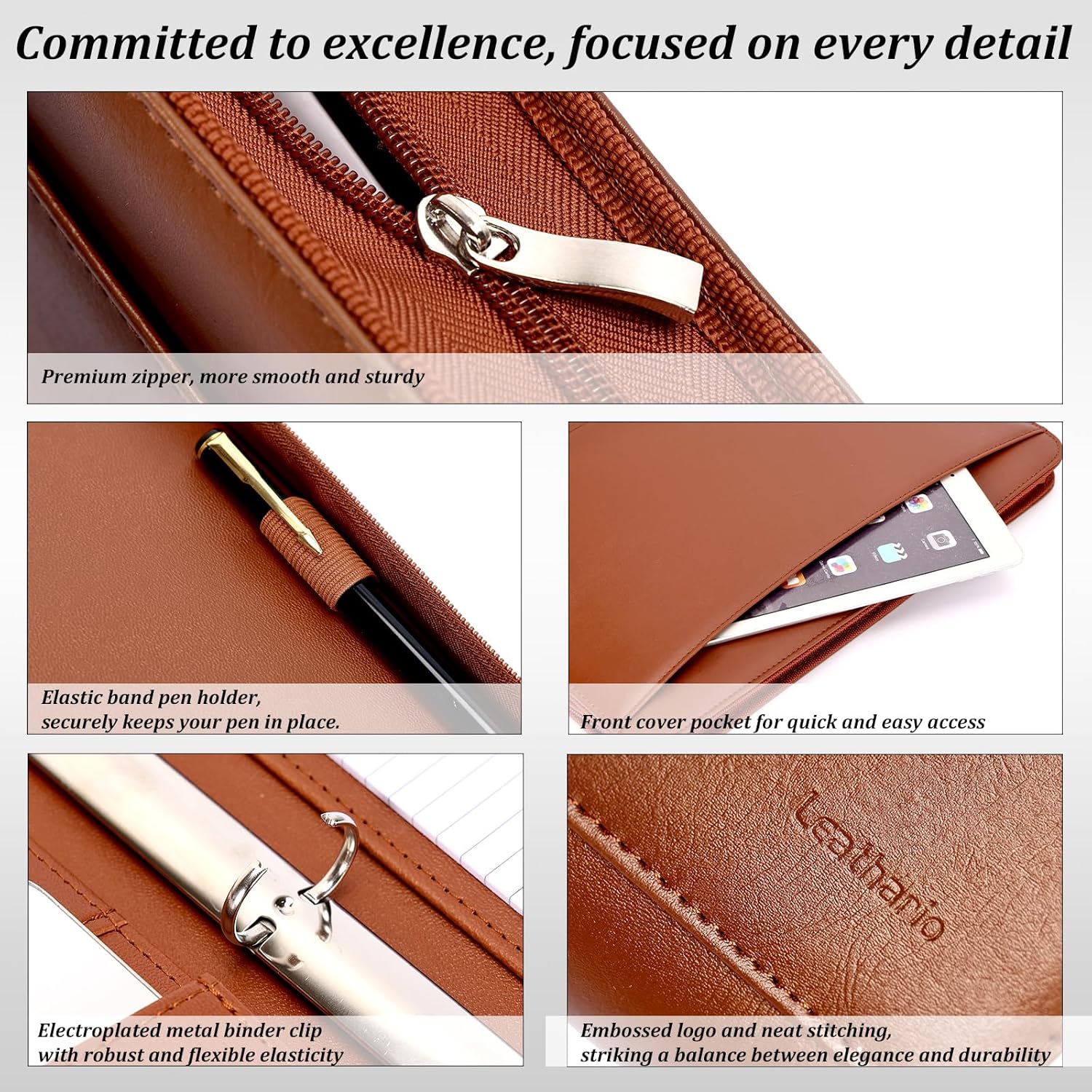 Leathario Portfolio Binder, Includes 10 Sheet Protectors and 3 Notepads, 3-Ring Folder Organizer, A4 Padfolio with Zipper, Vegan Leather Tablet Sleeve, Business Office Conference Clipboards