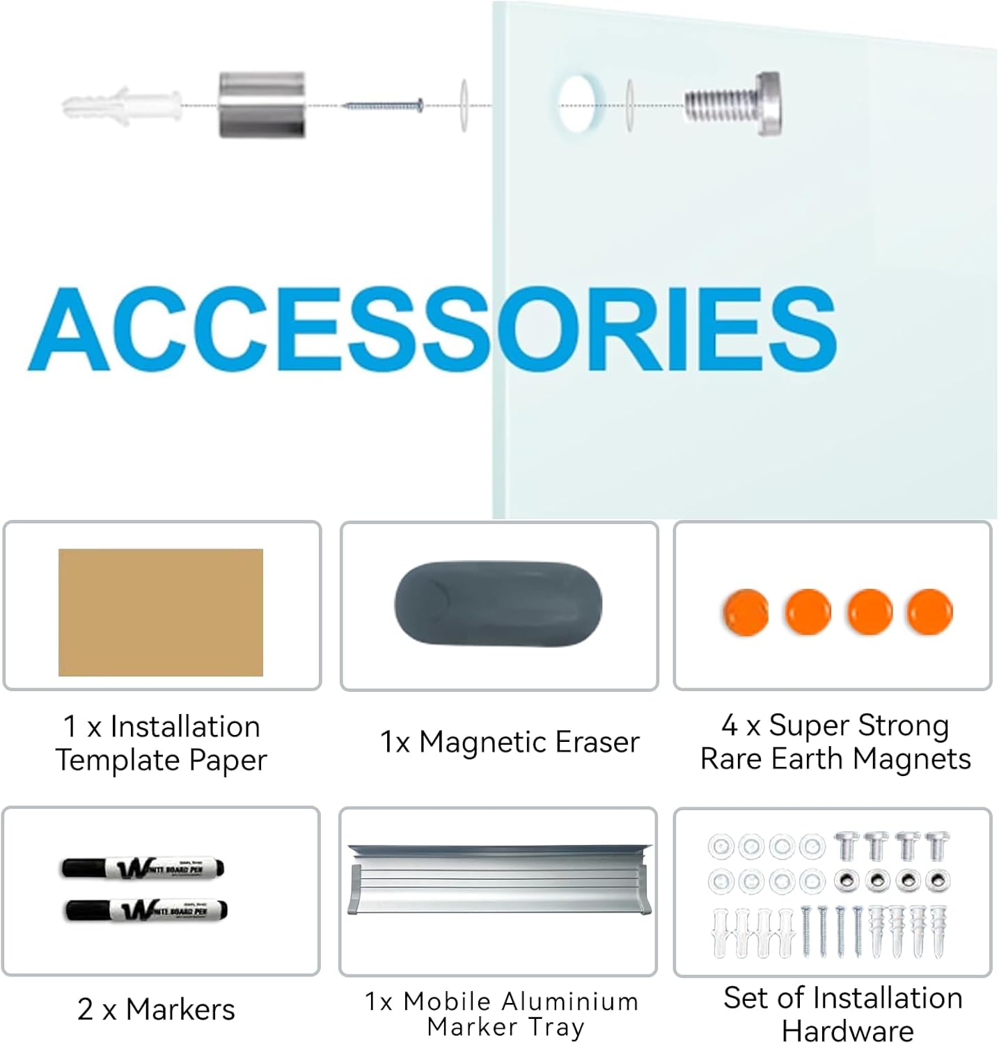 - Super Strong Magnets: Unlike the traditional aluminum frame whiteboard, our glass board needs stronger magnetic power. For the best experience, use magnets that we have provided you with super strong magnets (Not applicable: fridge magnets and normal black magnets)