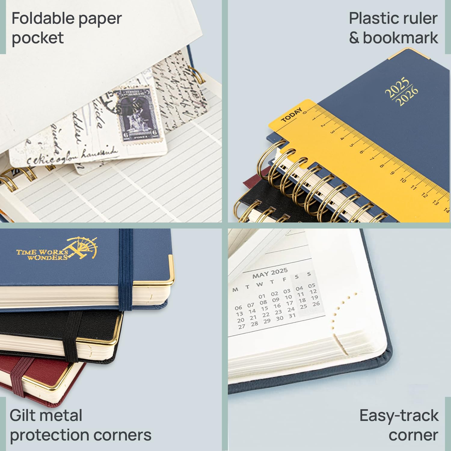 - BUILT-IN EXTRAS: The Flexible " TODAY " Ruler allows you to quickly navigate and locate the current date. Tear-off Corners and Bookmark Ribbons allow you to mark important pages and an Elastic Closure ensures your planner stays securely closed. Plus, the Foldable Pocket at the back provides the perfect space to store notes, photos, and documents.
