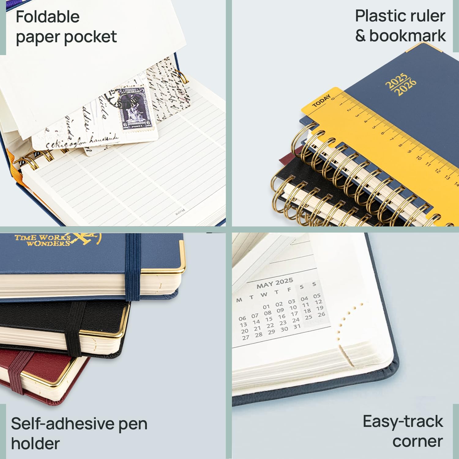 - BUILT-IN EXTRAS: The Flexible " TODAY " Ruler allows you to quickly navigate and locate the current date. Tear-off Corners and Bookmark Ribbons allow you to mark important pages and an Elastic Closure ensures your planner stays securely closed. Plus, the Foldable Pocket at the back provides the perfect space to store notes, photos, and documents.