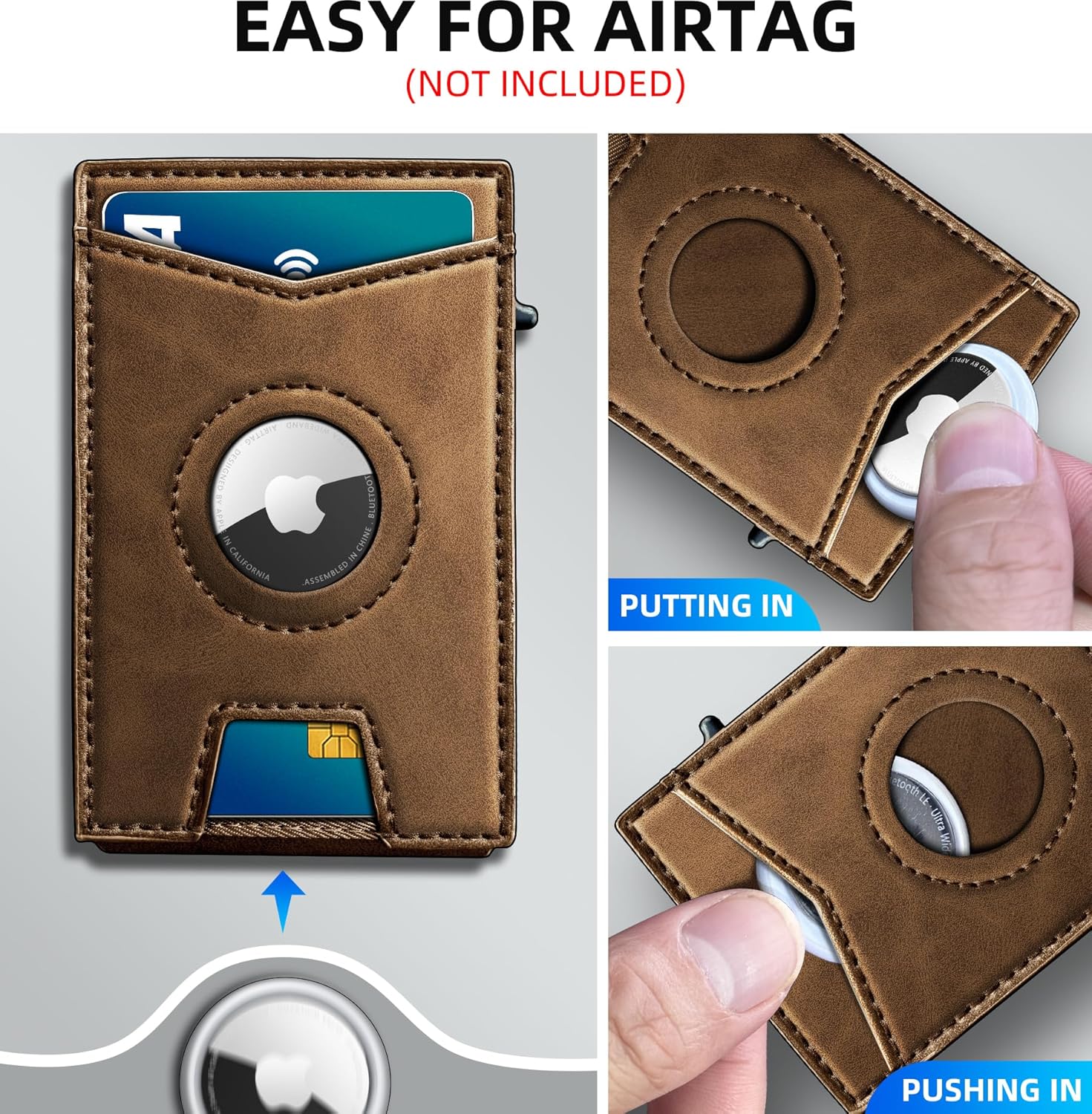 - AMPLE STORAGE--Easy for 9 cards and holds Airtag,Slim wallet with refined layout to fit in front pocket,the money clip with Leather wrapped for carry cash,5 cards in the aluminum case with pop-up access,4 cards in the leather shell;
