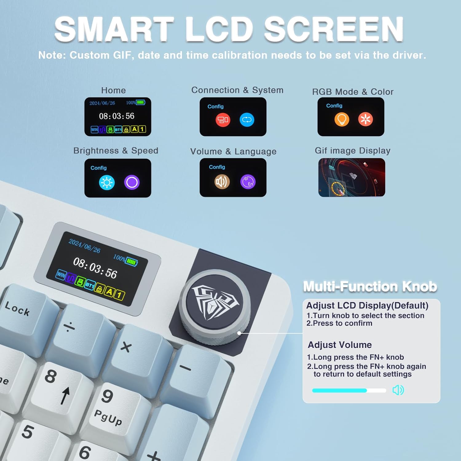 - Smart LCD Screen & Multi-function Knob: Stylish AULA S98 Pro wireless mechanical keyboard with smart LCD screen and multi-function knob will lead the new trend. The screen homepage displays various information such as date, time, battery level, system, connection mode and status indicator. By rotating or pressing the multi-function knob, you can adjust the system, connection mode, volume, RGB light mode, language and screen image/GIF(Note: You need to download the software under windows system and keep in wired mode to set the screen image/GIF, calibrate the date and time)