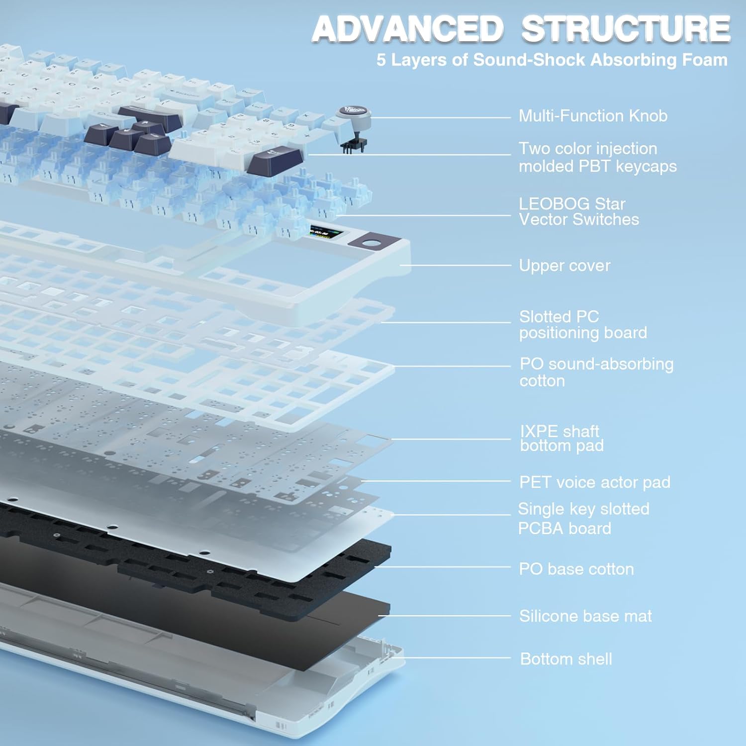- Mechanical Keyboard with Advanced Structure: The S98 Pro thocky heavy computer keyboard features an advanced construction, extended integrated silicone pads, and PCB single key slotting to optimize elasticity and stability for a softer, more resilient typing experience. Five layers of sound deadening material fills the gap between the PCB, the positioning plate and the shaft, effectively counteracting the cavity noise sound of the shaft hitting the positioning plate, provide a stable and comfortable typing sound and solid feel