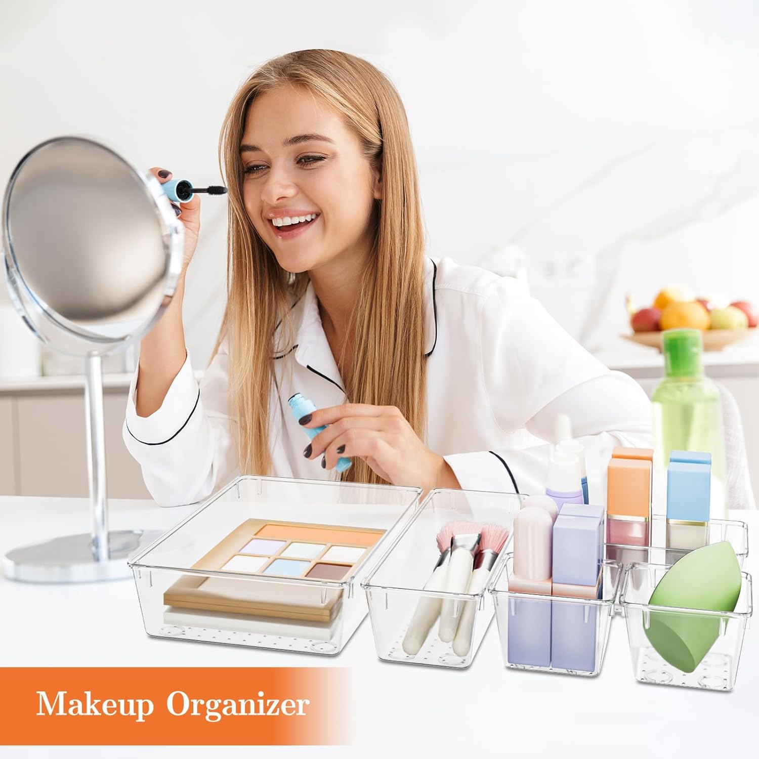 25 PCS Plastic Drawer Organizer Set, 4-Size Versatile Organizer Trays & storage Bins for Makeup, Jewelry, and Gadgets in Bathroom, Bedroom and Office,Clear White
