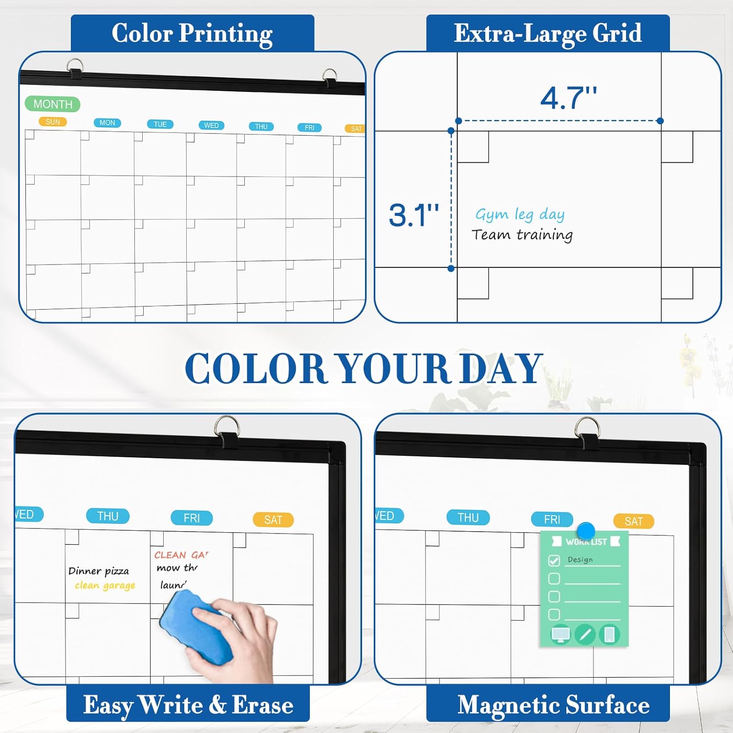 - 【Double-Sided Versatile Calendar Whiteboard】2-in-1 functionality combines a monthly calendar on one side and a blank dry erase whiteboard on the other, offering ample space for planning your to do lists, daily,weekly planner and month schedules, memos and creative ideas.A must-have for home,office,or school—keeps your tasks visible, tracks study or training plans, coordinates family activities and ensures your work stays organized and efficient.