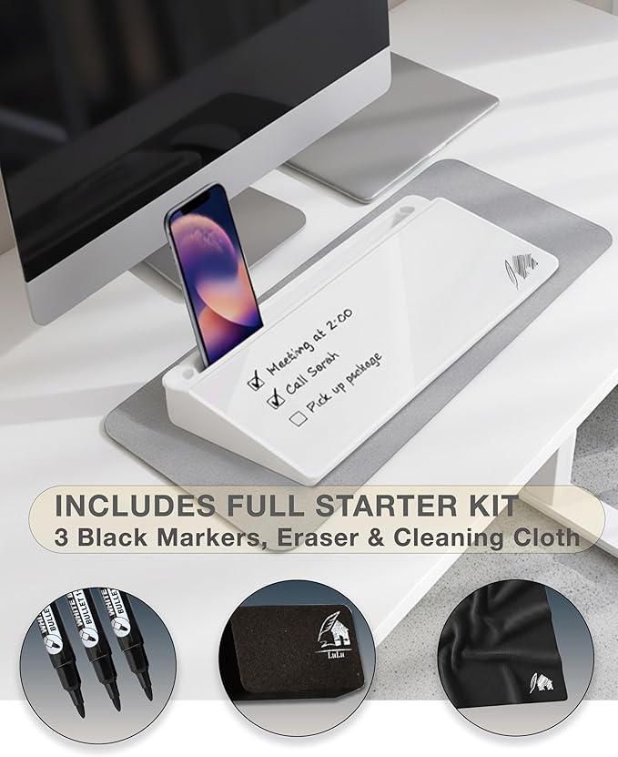 - Smooth Writing & Effortless Erasing: Enjoy crisp, easy writing and instant erasing every time. The tempered glass surface ensures a smooth glide for markers and wipes clean without ghosting - no stains, no smudges, just clarity. includes 3 dry erase markers, 1 leraser, and 1 microfiber cleaning cloth for a complete, ready-to-use desk setup.