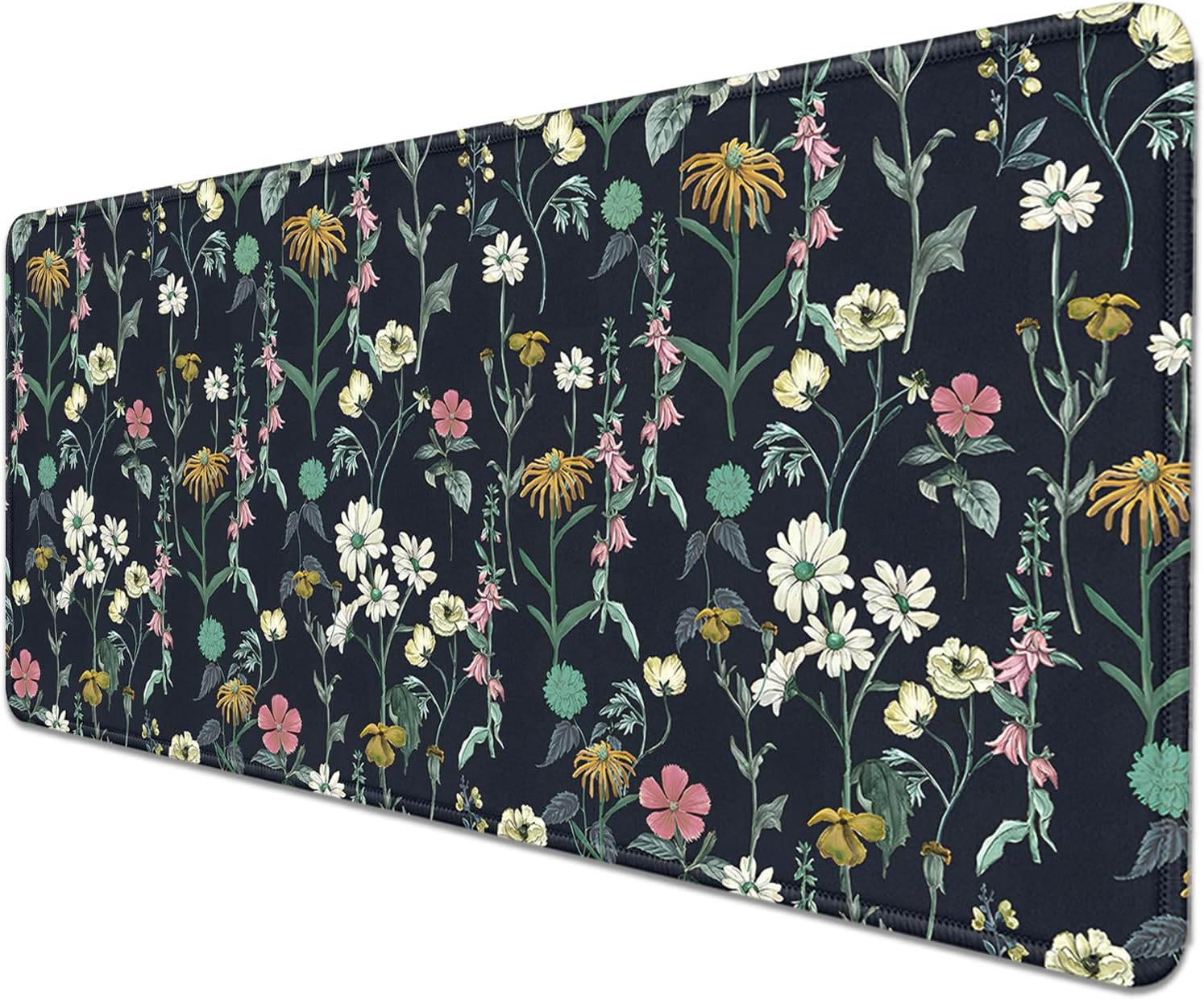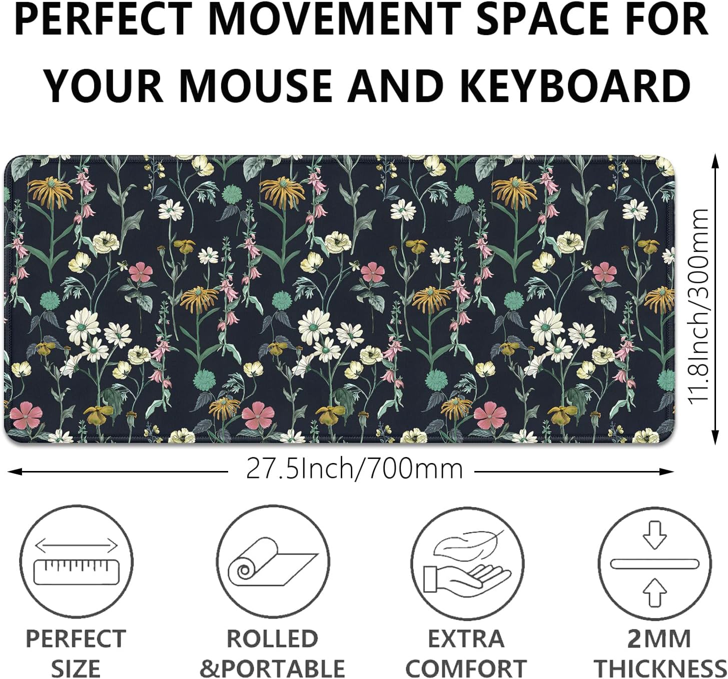 Dark Botanical Flowers Mouse Pad,Extended Black Plant Floral Mousepad Desk Pad with Stitched Edges,Non-Slip Waterproof Rubber Base Mouse Mat for Office Computer Keyboard Laptop Home(27.5x11.8 in)