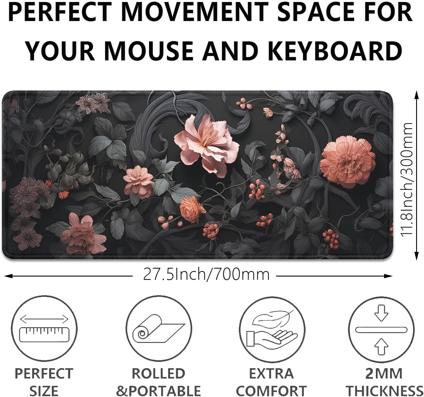 Black Art Flowers Mouse Pad,Large Vintage Floral Mousepad Desk Pad with Stitched Edges,Non-Slip Waterproof Rubber Base Mouse Mat for Office Computer Keyboard Laptop Home(27.5x11.8 in)