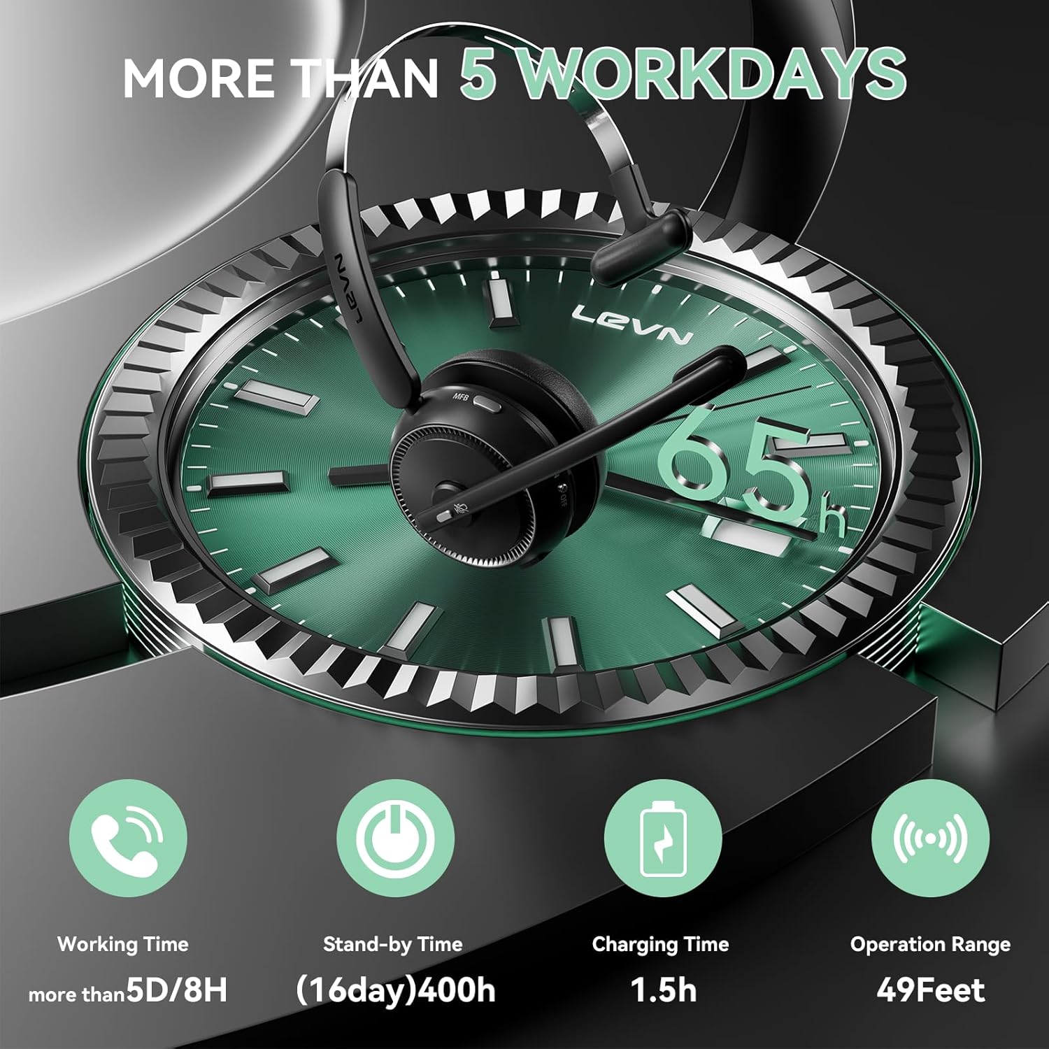 LEVN Wireless Headset 5.2 for Call Center, Bluetooth Headphones with Mic for Work(Noise Cancelling), 65 Hours Woktime & Mute Button,Wireless Headset for Work from Home/Office/PC/Computer/Laptop(Black)