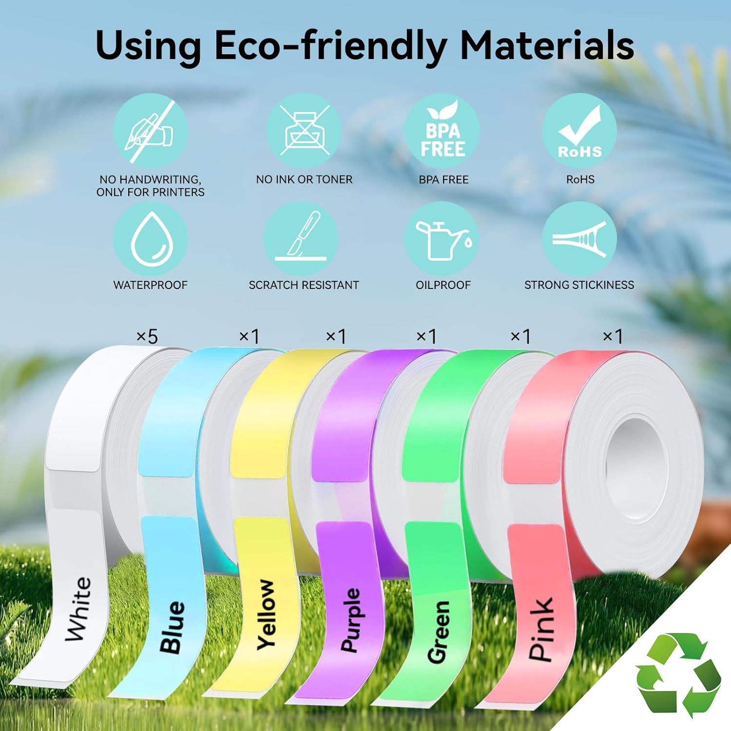 - Label Maker Tape — You could get 10 rolls of labels in total, with sizes 12x40mm (0.47"x1.57"), 165 labels/roll, and 1650pcs in total. It is white 5 rolls, blue 1 roll, yellow 1 roll, purple 1 roll, green 1 roll, and pink 1 roll.