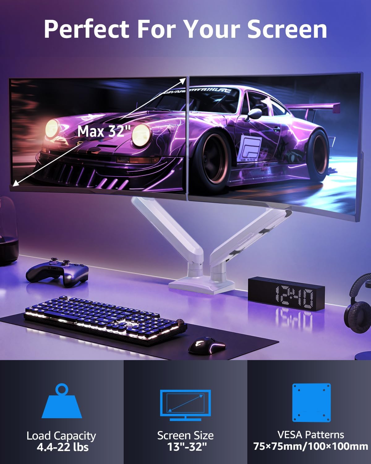 Dual Monitor Mount for 32 27 24 22inch Screens, Gas Spring Monitor Stand for 2 Monitor, Full Adjustable Monitors Desk Mount with C-Clamp&Grommet Base, Each Arm Holds 4.4-22 lbs, Freelift Pro White