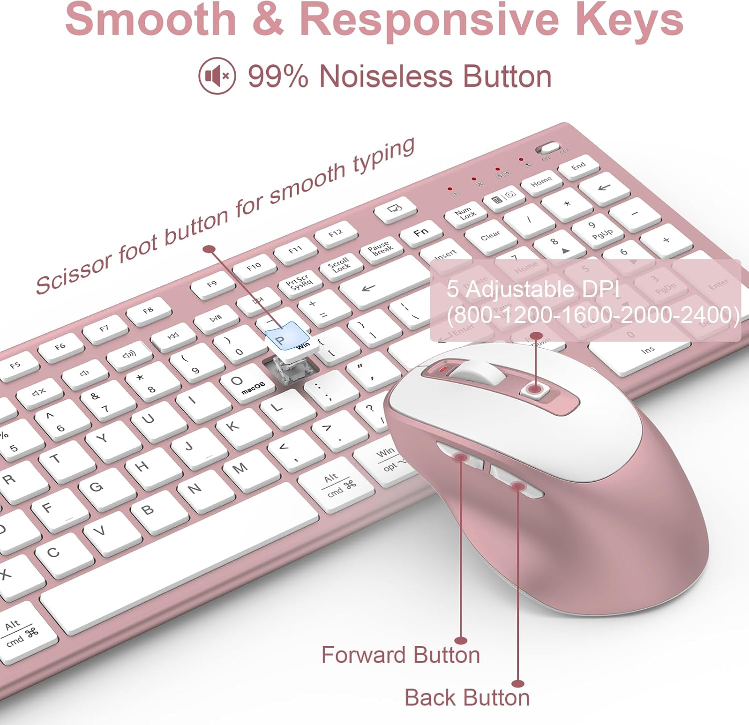 FENIFOX Wireless Keyboard and Mouse, Ergonomic Rechargeable Silent Quiet Slim Compact Full-Size USB C with Number Pad Flat Soft Cover for PC Computer Laptop Mac MacBook iMac Windows - Pink Rose Gold