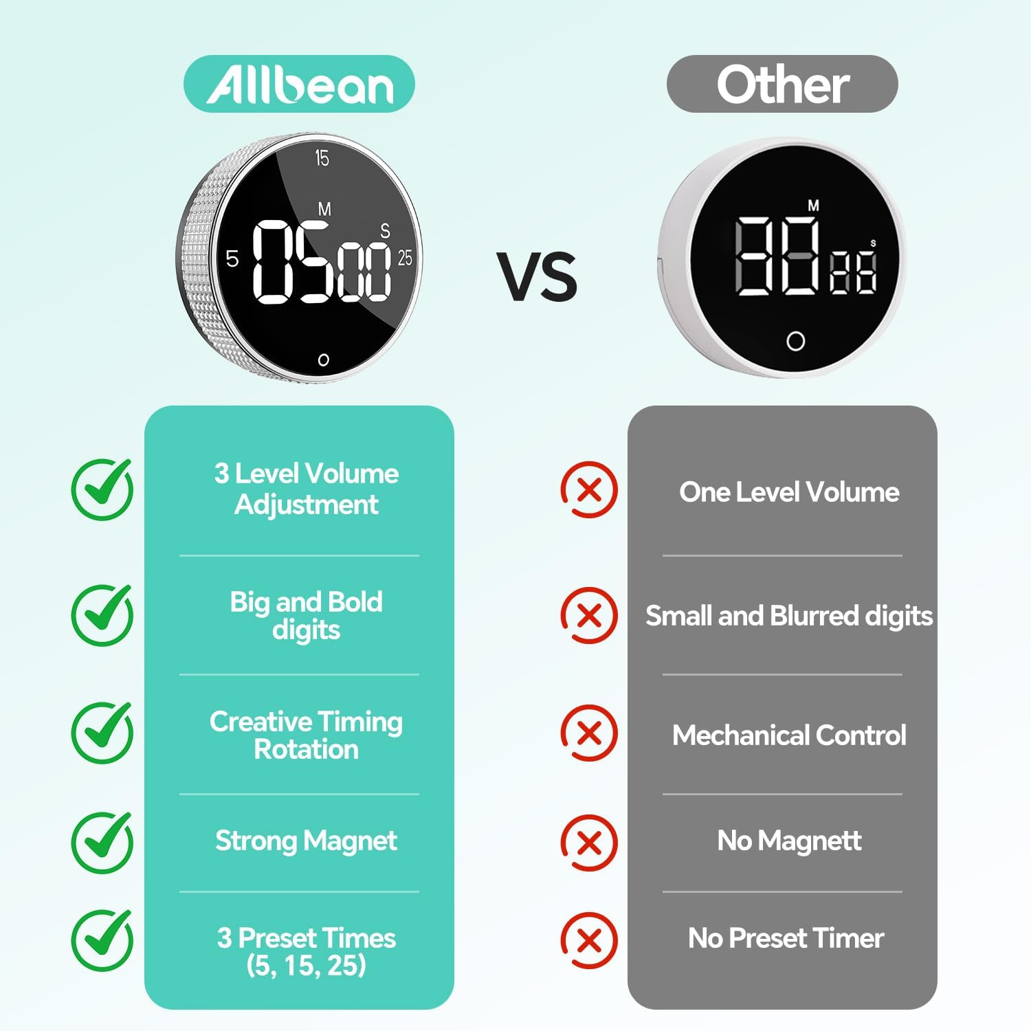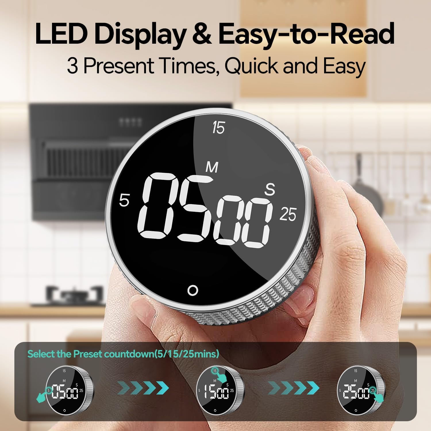 - 【3 Convenient Preset Timers for Maximum Efficiency】: The Allbean kitchen digital timer features 3 preset options (5 mins, 15 mins, and 25 mins), perfect for quick, hands-free timing. With a large, easy-to-read LED display and bold digits, it’s designed to seamlessly integrate with the Pomodoro Technique—work for 25 minutes, then take a 5-minute break, helping you stay focused and boost productivity. Ideal for both work and kitchen tasks