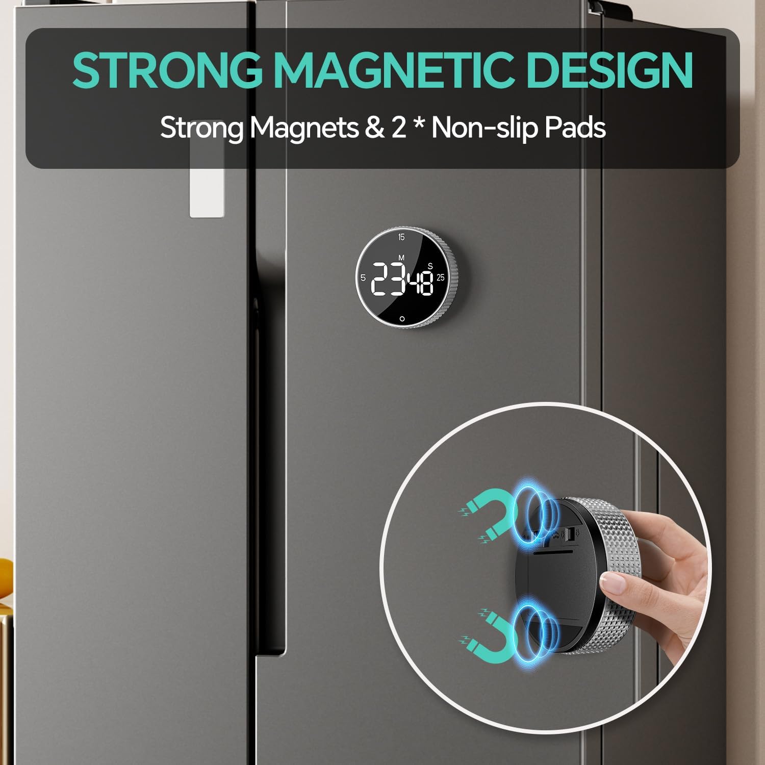 - 【Powerful Magnetic Design for Kitchen Convenience】: Our kitchen timer is equipped with two powerful magnets on the back, making it easy to attach to any metal surface such as refrigerators, ovens, or whiteboards. Non-slip pads ensure a secure attachment, even in the busiest of kitchens. Designed for effortless one-handed operation, it’s the perfect companion for cooking, grilling, and baking, helping you keep track of time without missing a beat