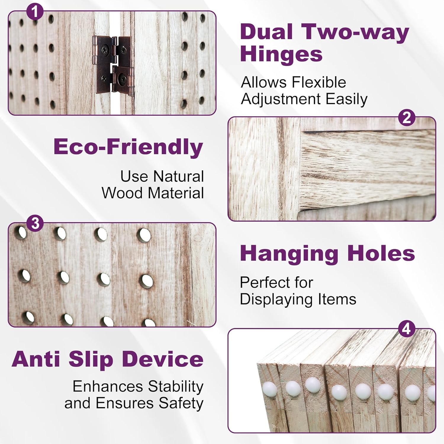 Room Divider, 5.6FT Folding Room Divider Panel, 4 Panel Pegboard Display Wood Partition Wall Divider for Room Separation& Craft Shows, Natural Wood