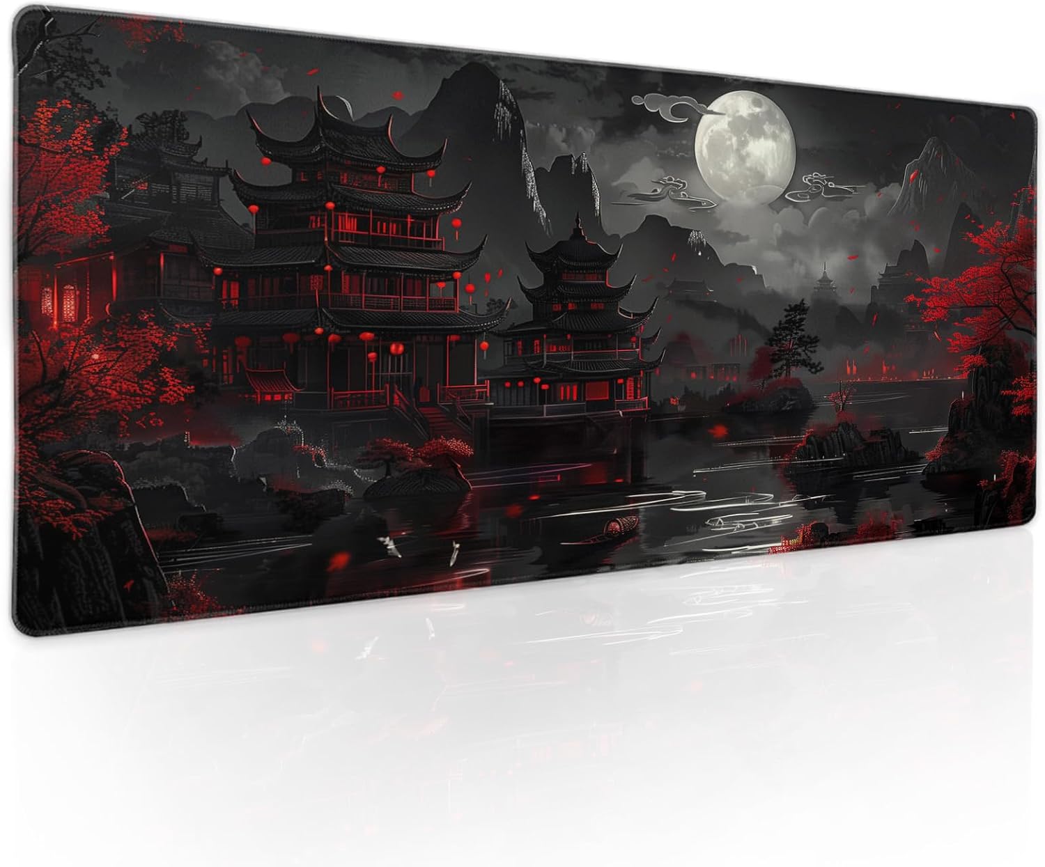 Full Moon Night Gaming Mouse Pad XLBlack Red Mountain Japanese Extended Large Mat Mousepad Desk Pad Non-Slip Rubber Base Stitched Edge Long Keyboard Pad for Computer,31.5×11.8 Inch