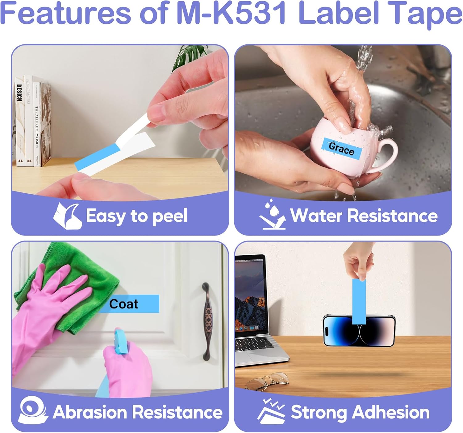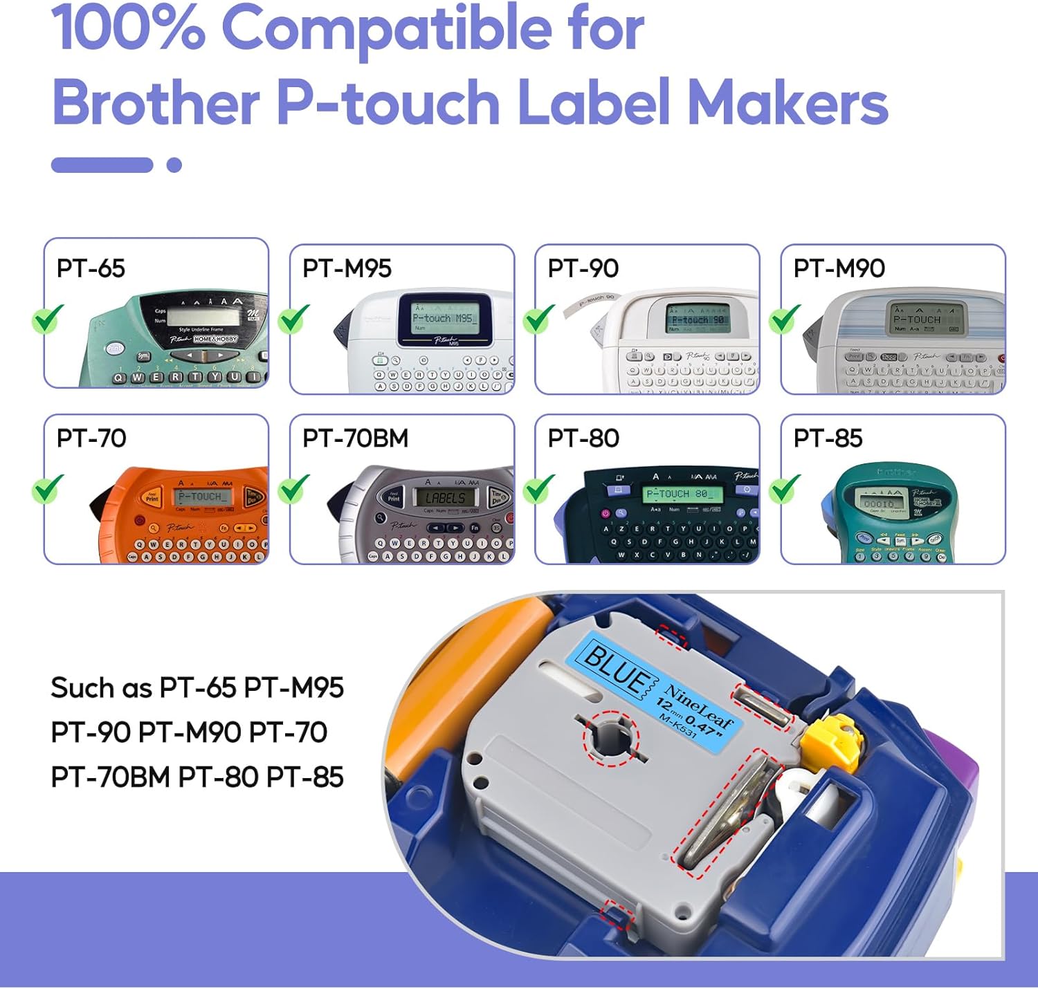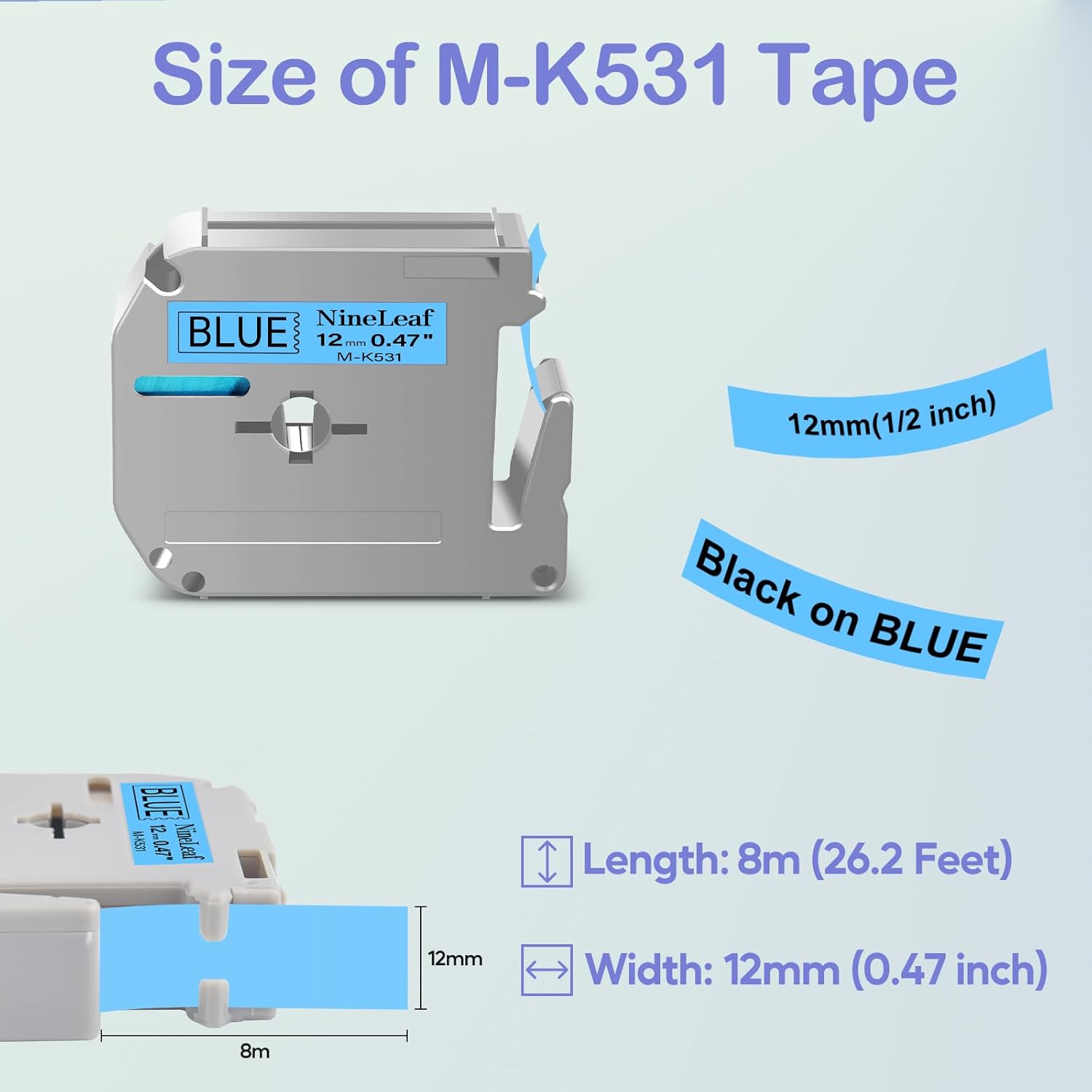 - NineLeaf Compatible for Brother P-touch MK531 M-K531 M531 M-K531S Non-Laminated Label Tape, Color:Black on Blue, Length:8m(26.2ft), Width:12mm(1/2")