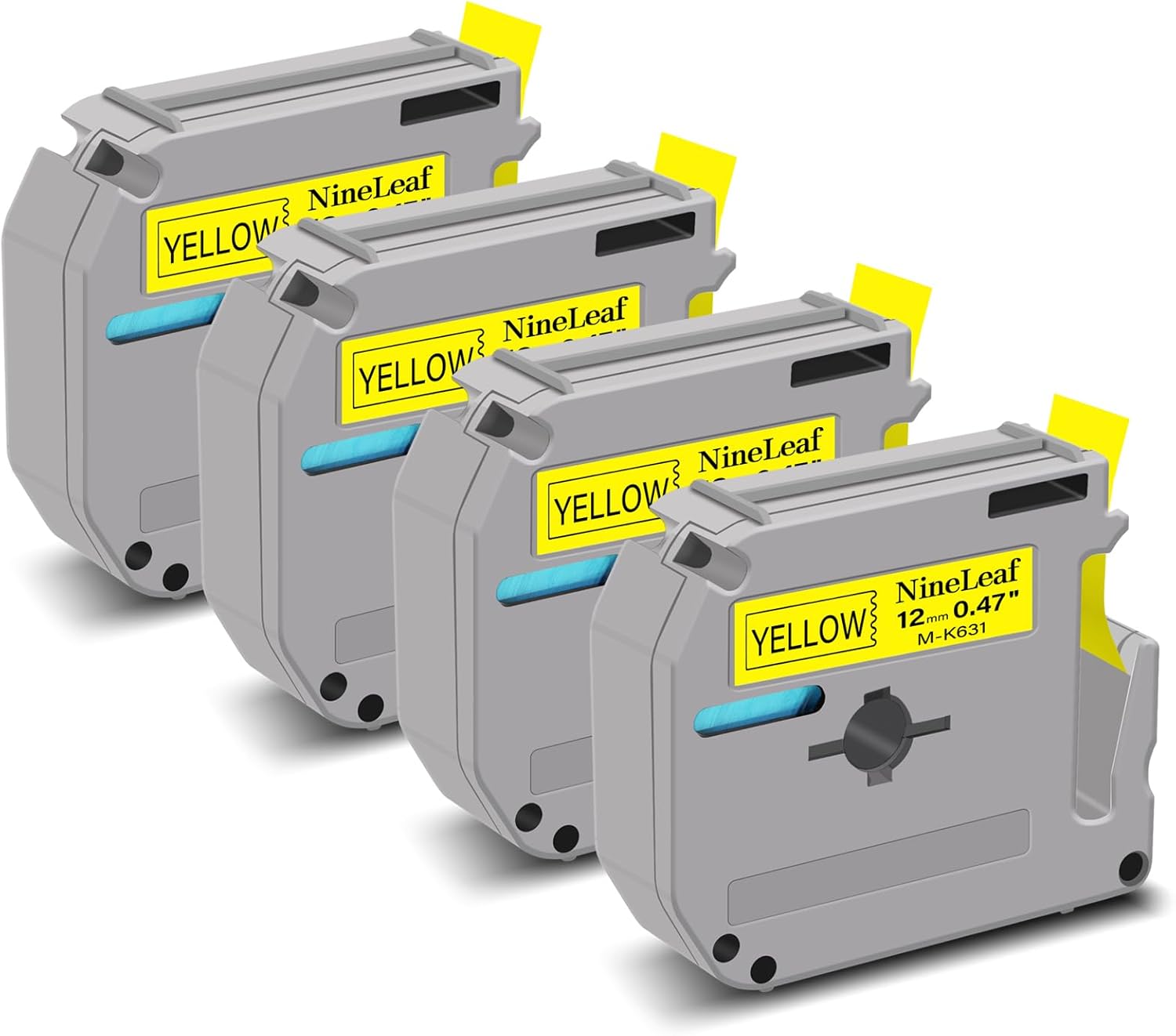 NineLeaf 4 Pack Compatible for Brother P-Touch M Tape M-K631 M-K631S MK631 M631 12mm 0.47'' Black on Yellow Label Tape for PT-70BBVP PT-70BMH PT-70HK PT-70HOL PT-70HOT Label Maker