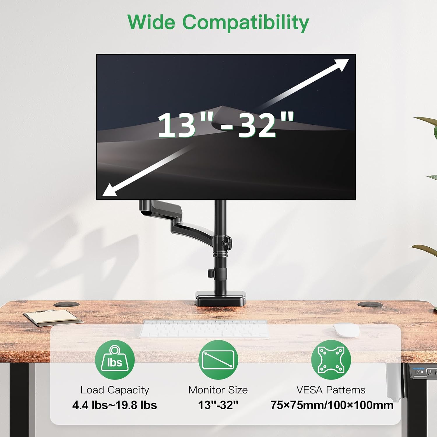- Suitable for Your Monitors: Our single monitor arm perfectly fits most flat or curved LCD/LED screens from 13" to 32", holding 4.4-19.8 lbs, suitable for VESA 75x75mm & 100x100mm patterns. Compatible with ASUS, Acer, Samsung, LG, AOC, Dell, etc. not limited to 32 30 28 27 25 24 23 22 21 20 19 17 inch screen, but not compatible with 1000R/1500R/1800R curved screens.