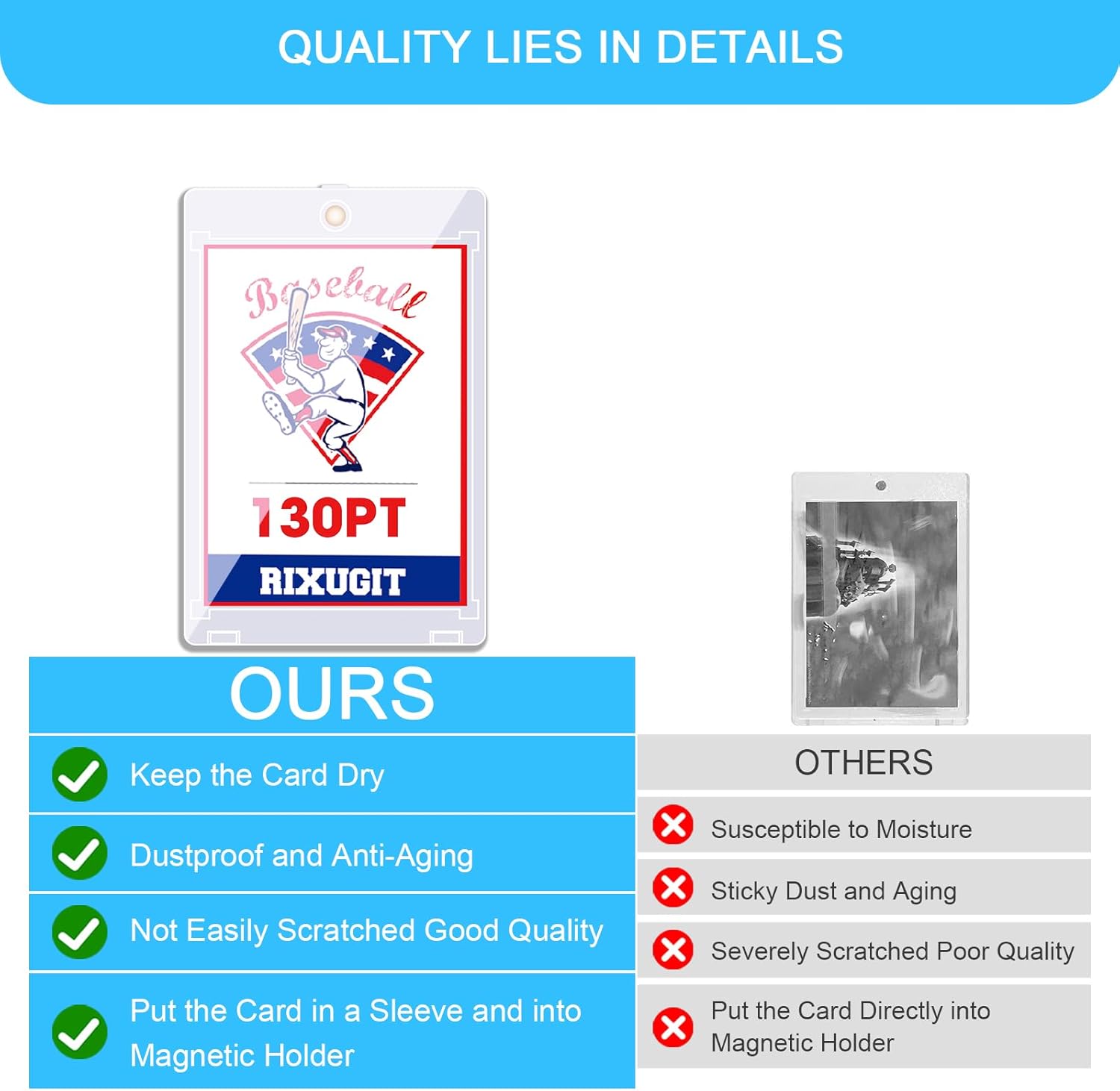 - High quality material selection: 130PT magnetic card holder are made of high-quality transparent materials, which not only have excellent scratch resistance, but also effectively prevent stains and bending, UV protection, and provide reliable protection for your precious cards