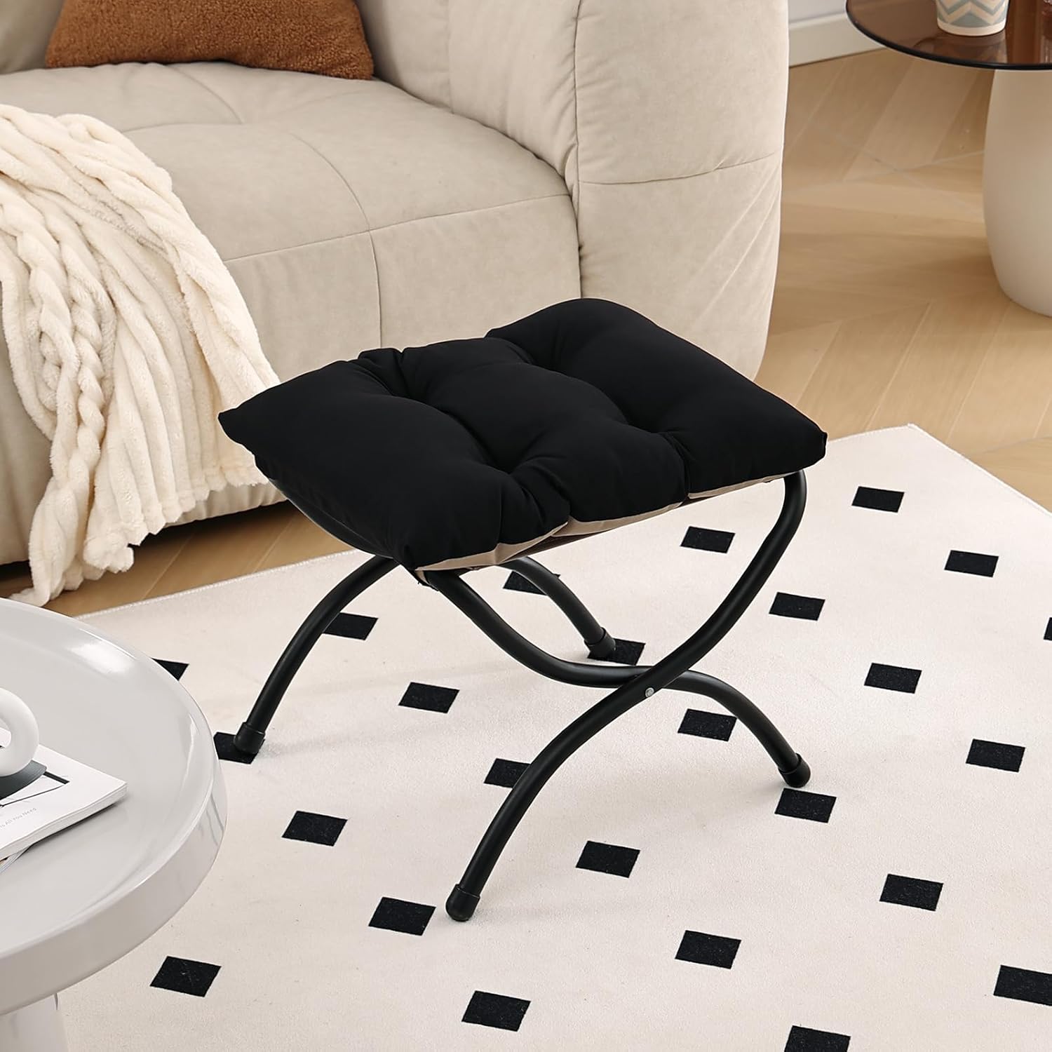 LITA Folding Upholstered Footrest Stool, Modern Small Portable Accent Ottoman with Detachable Thick Cotton Cushion Padded Sofa Stool with Metal Frame for Lazy Chair, Living Room & Bedroom, Black