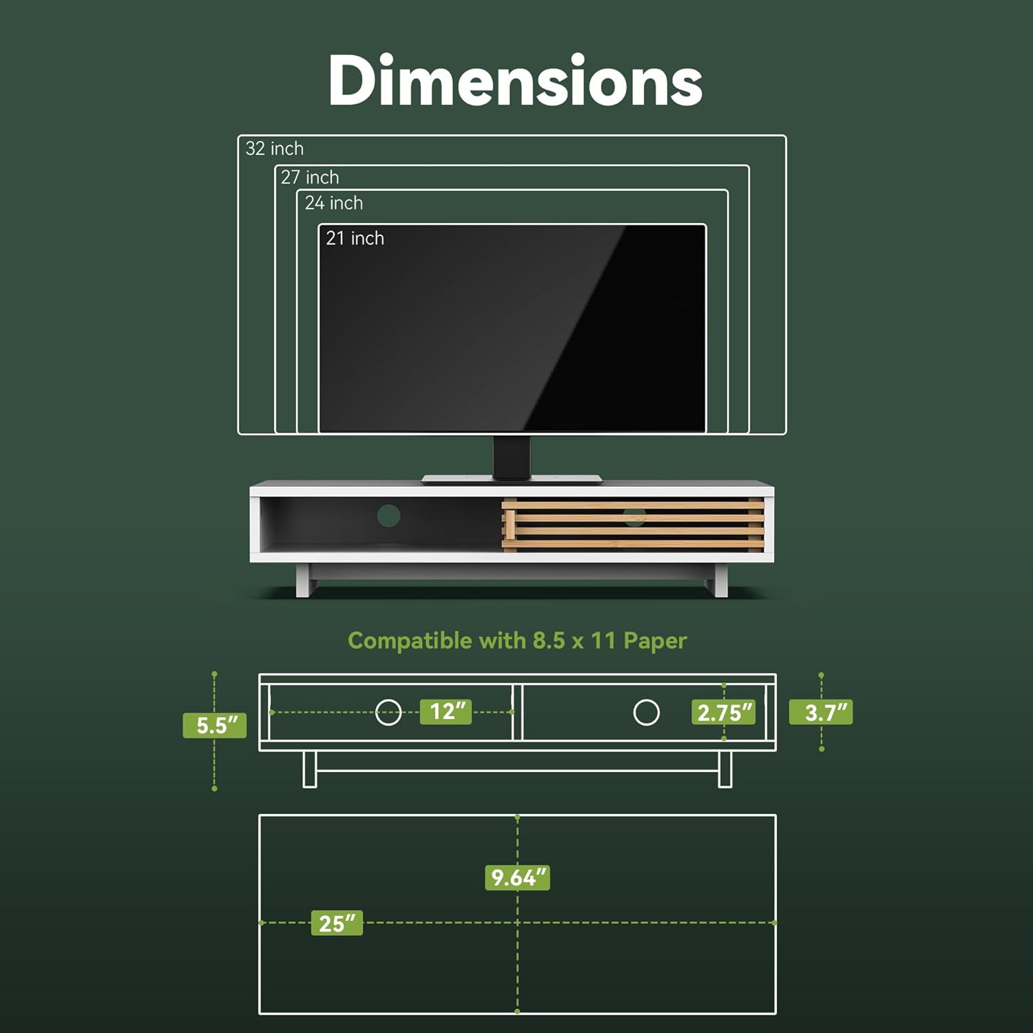 Monitor Stand Riser with Sliding Door, Computer Laptop Stand Desk Shelf Organizer with Storage (White + Natural Bamboo, 25 Inch)