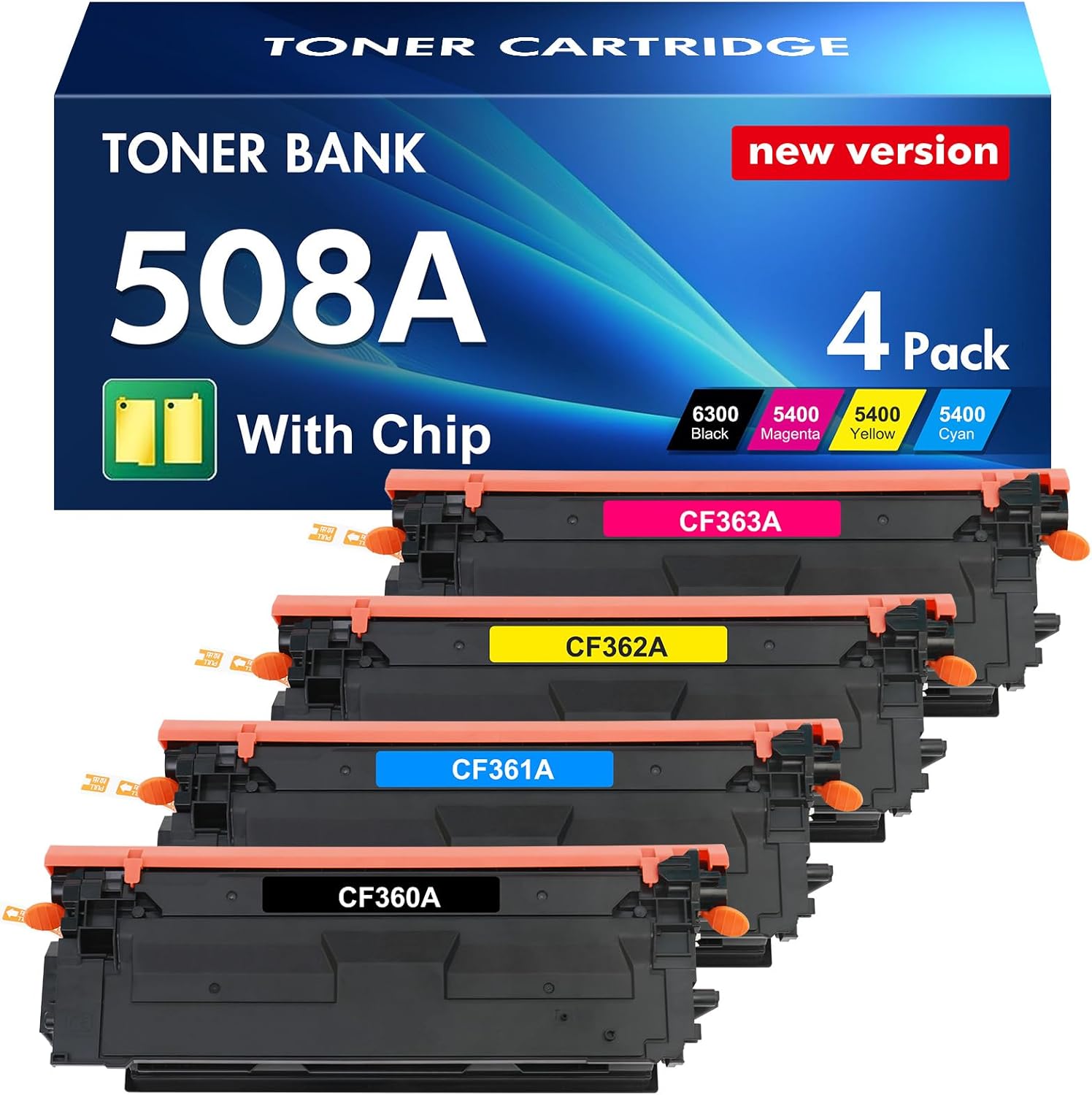 - Include: New Version 4 packs 508A M553 toner cartridges compatible for HP CF360A CF361A CF362A CF363A 508X black cyan yellow magenta toner cartridges (compatible for HP 508X CF360X CF361X CF362X CF363X toner cartridges)