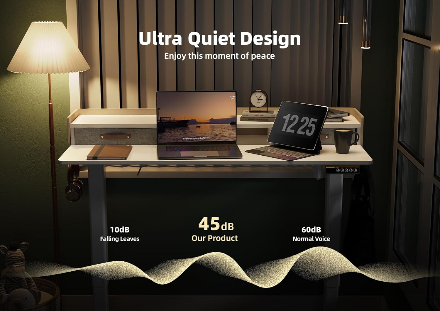 - 2-Tier Adjustable Shelf Stand - YDN standing desk with storage and unique felt fence design. The mid desk top with 2 adjustable heights, provides you with a more ergonomic way to view your monitor.