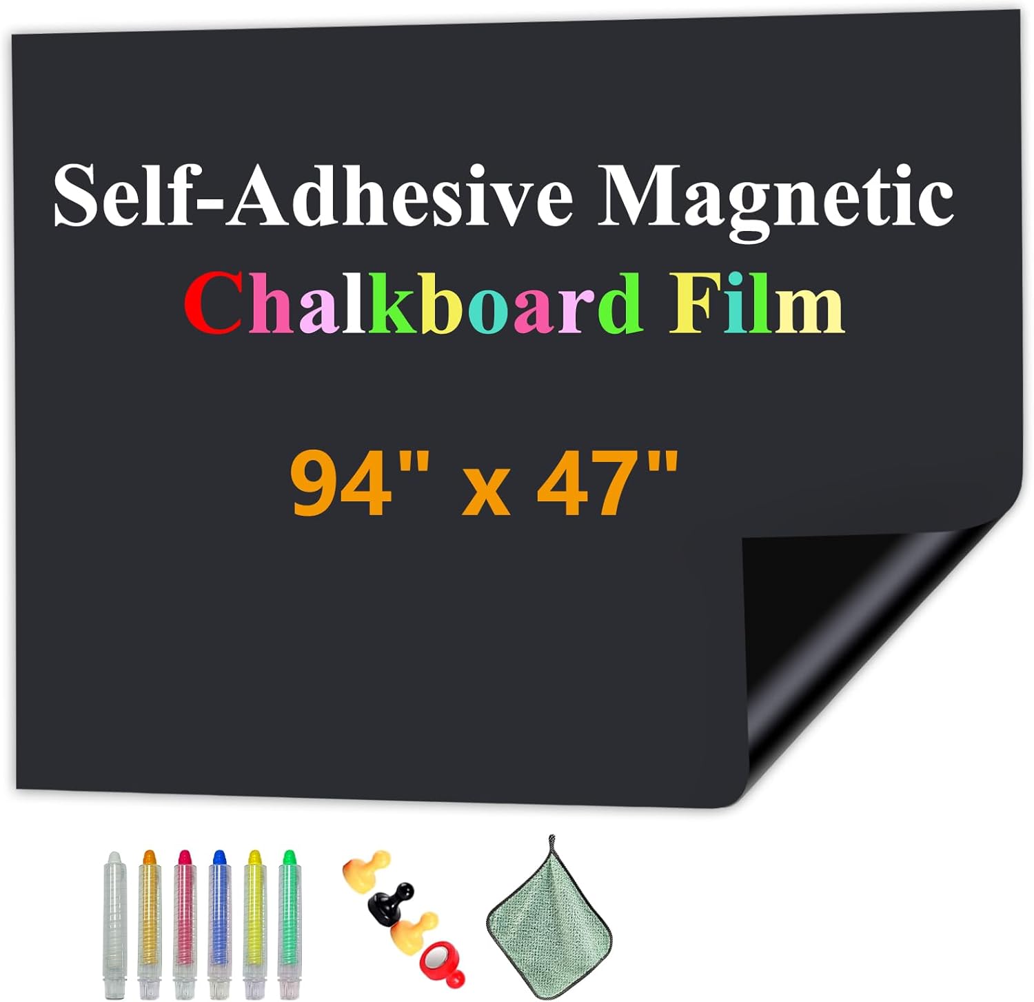 Magnetic Chalkboard Contact Paper with Adhesive, 94" x 47" Magnetic Blackboard Film for Walls, Peel and Stick – Ideal for Office, Classroom, Home. Includes Dustless Chalk, Wiping Cloth, and Magnet