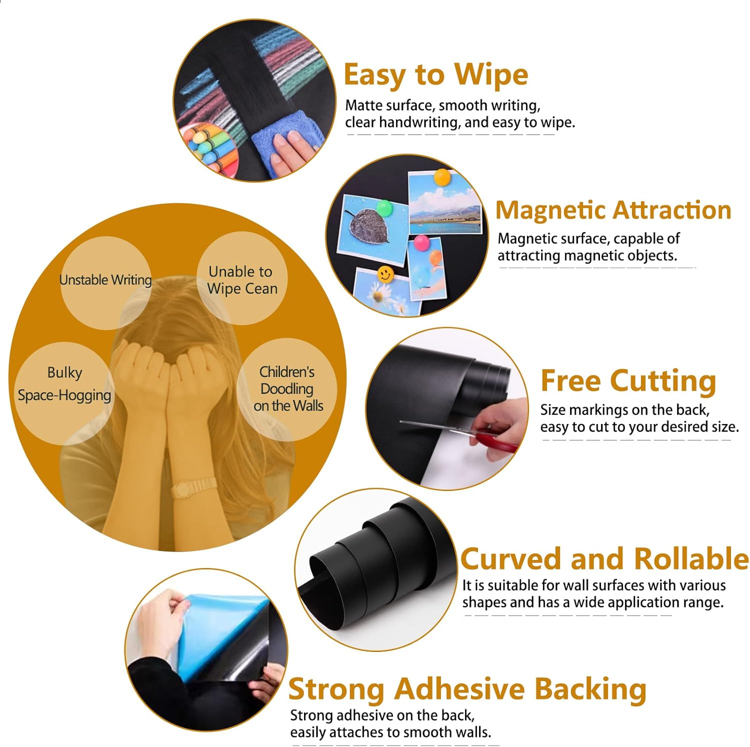 - {Peel & Stick – Tool-Free Installation} The JUMUBOARD magnetic chalkboard film features a strong adhesive backing, making installation a breeze. Simply peel off the backing and stick the film directly onto any smooth wall. It’s space-saving, requires no tools, no drilling, and won’t damage your walls. You can apply it to offices, kids' rooms, doors, windows, refrigerators, and more. It’s versatile and becomes a great helper in both your home and work life.