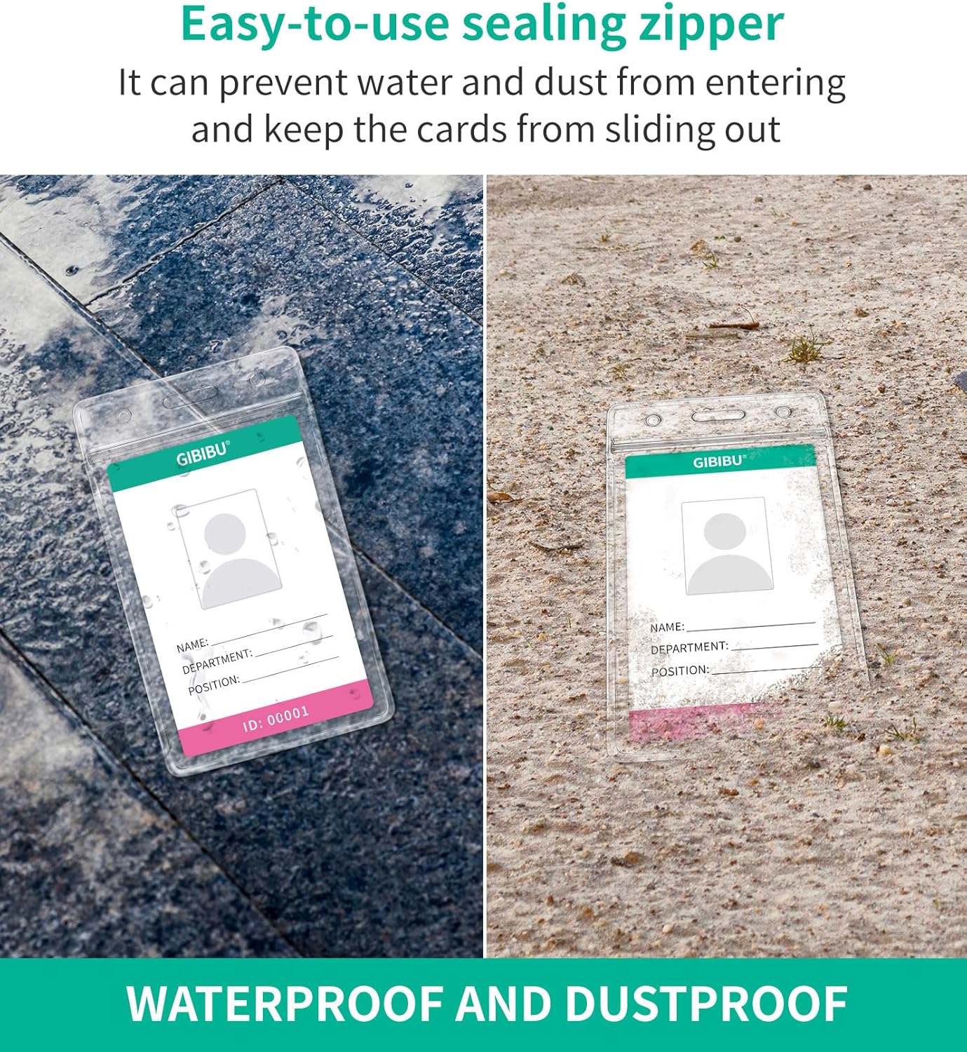 - MULTI-PURPOSE DESIG: Badge sleeve with zipper, waterproof and dustproof, keeps your cards and money safe and dry; Dual-use hanging design: the middle slot for lanyard, keychain, or retractable carabiner reel clip, the side holes for strap/string/cord/thread etc.