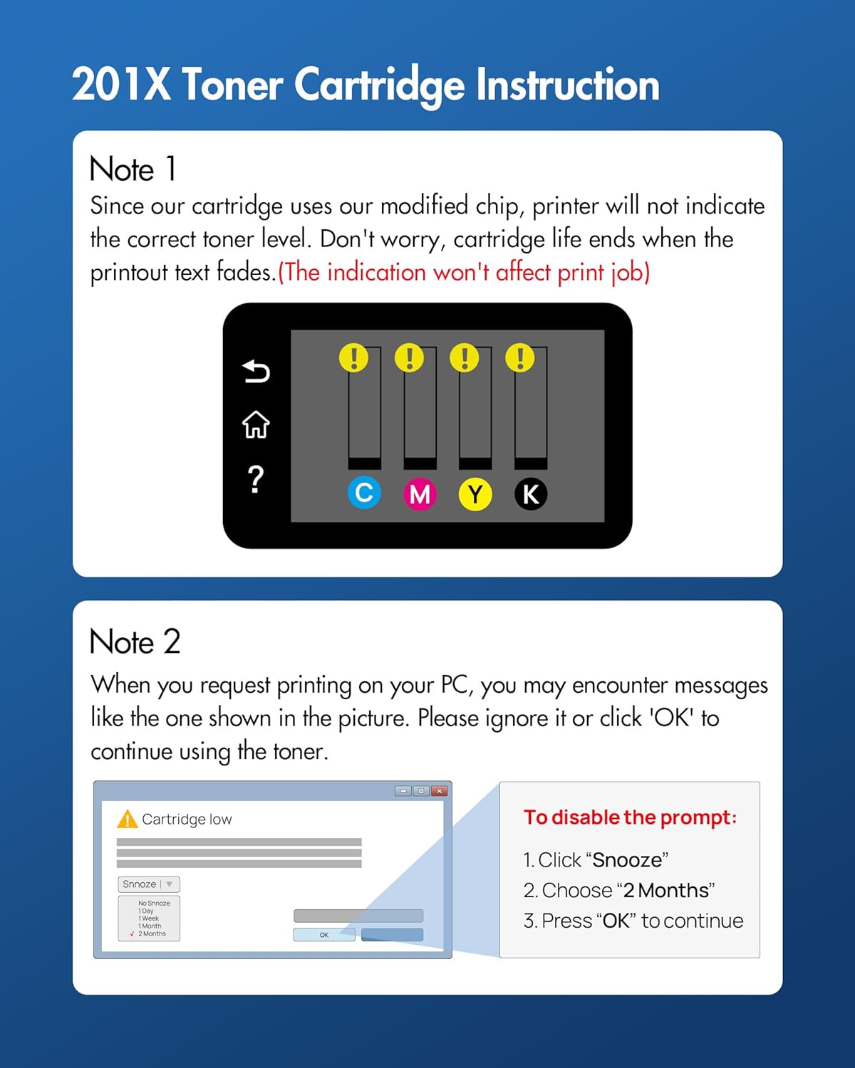 - Package Content: 201X Toner Cartridges 4 Pack High Yeild Replcement included-1 201X CF400X Black toner, 1 201X CF401X Cyan, 1 201X CF403X Magenta, 1 201X CF402X Yellow)