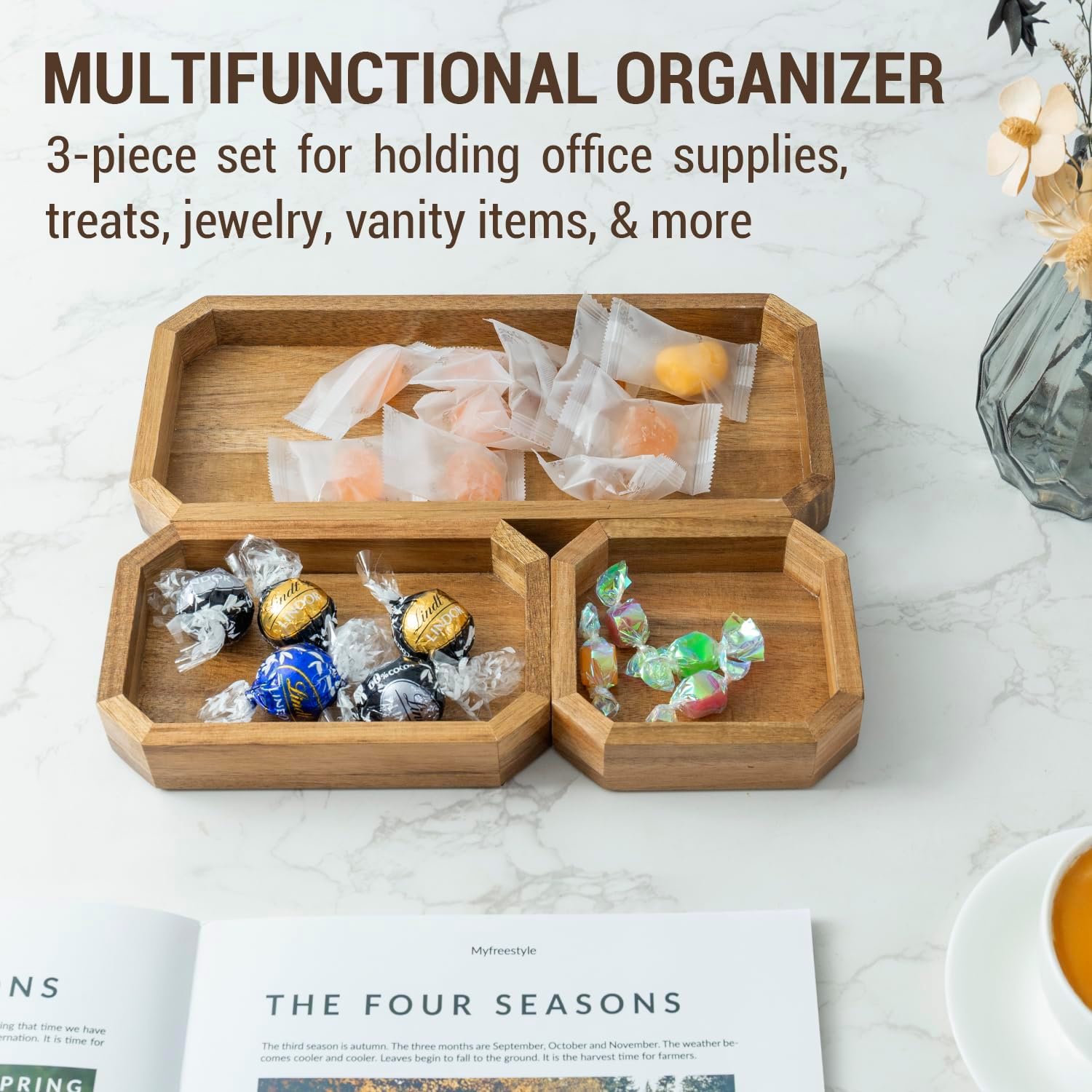 - Each tray in this set is meticulously crafted from premium solid Acacia wood, featuring a unique octagonal shape with smooth edges. This design not only enhances the visual appeal but also adds a contemporary and polished touch to any desk, making it a standout addition to modern or classic office decor.