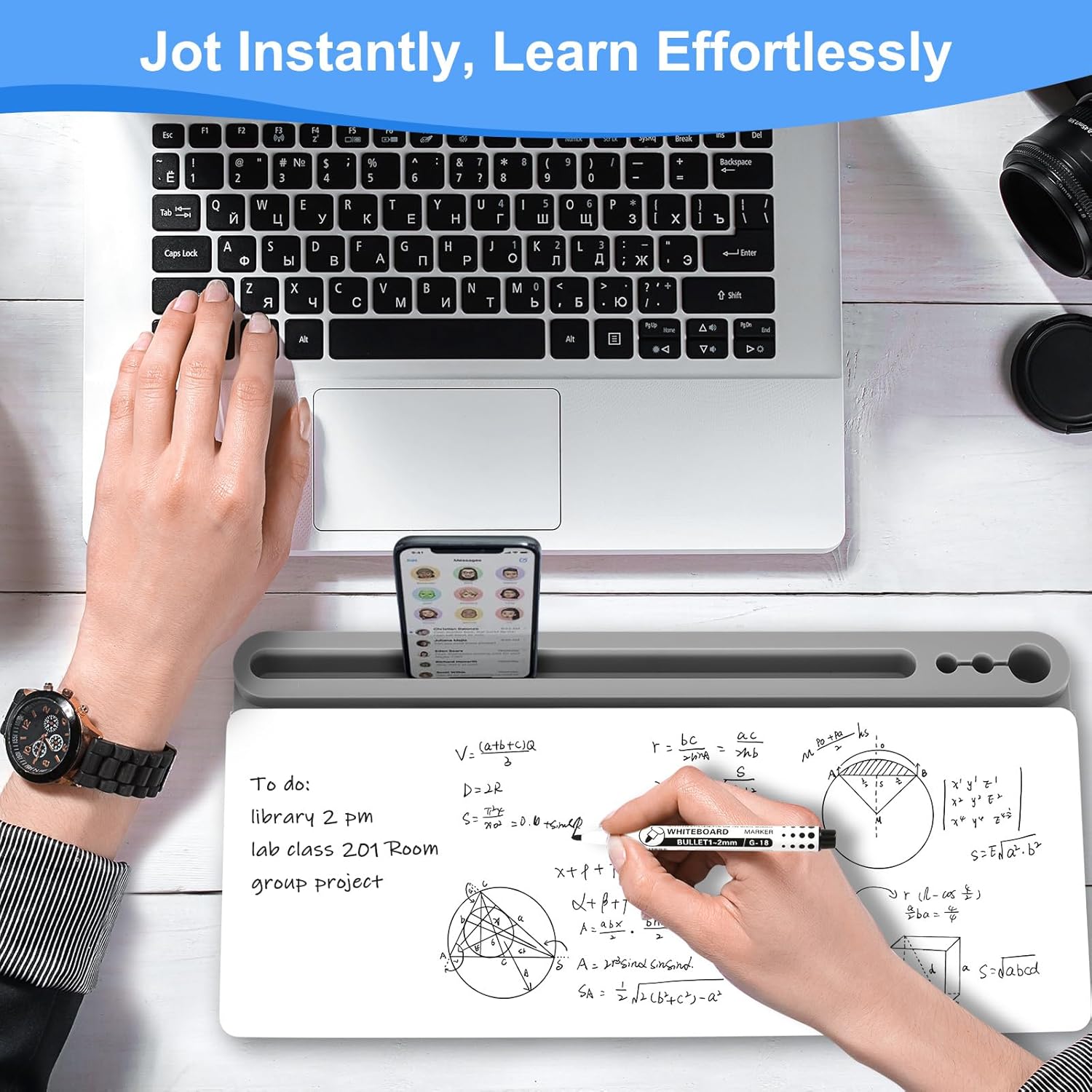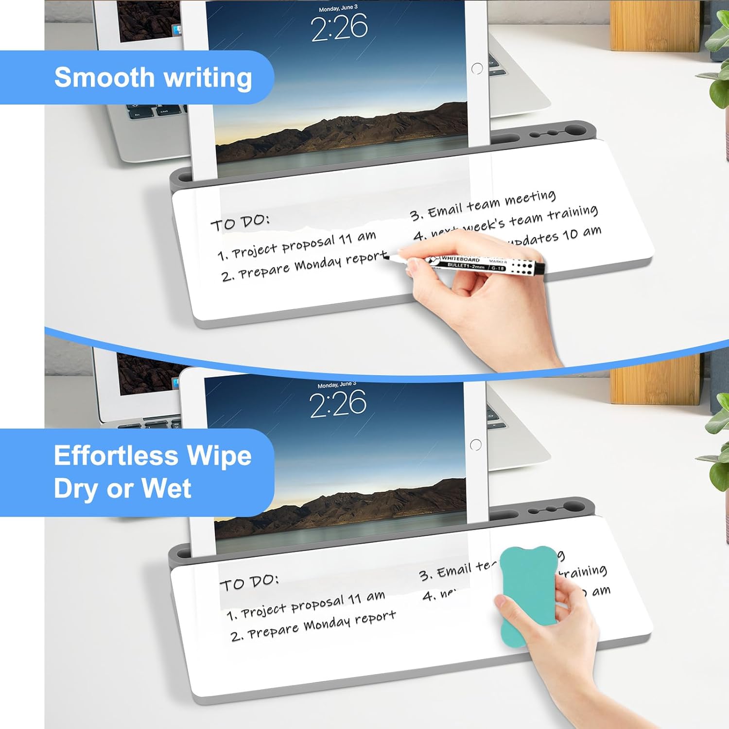 - Multiple Functions - To enhance the overall convenience of the product, this whiteboard includes 1 large pen holder, 2 small pen holders and 1 slot on the top which can hold 3 markers, a tablet and a phone. Equipped with charging port notch in the slot, the desk board is a good option to realize office charging, and you can charge your phone quickly. This dry erase board is more ergonomic with the perfect ramp design and non-slip design, which can make itself be used as keyboard pad.