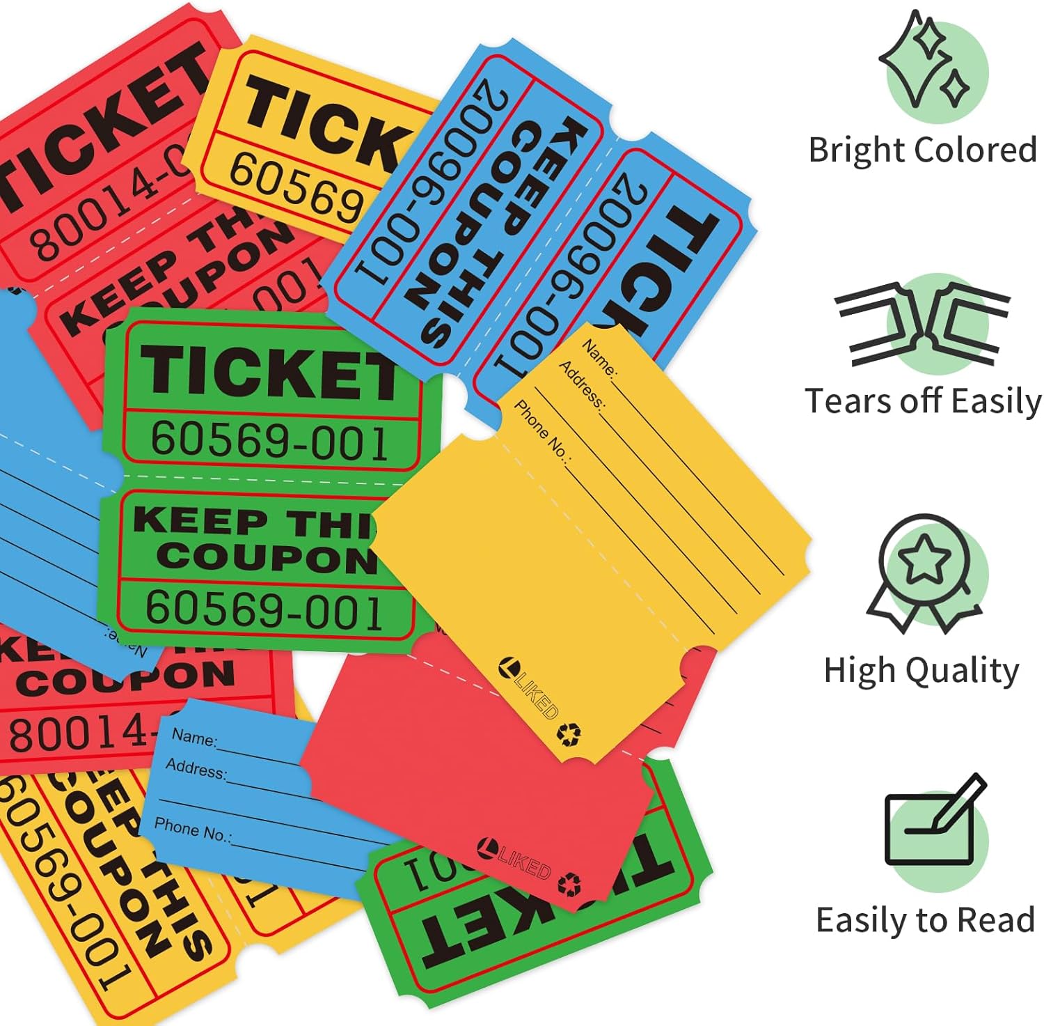 L LIKED 4000 Pairs Double Raffle Tickets - 4 Assorted Colors (Blue, Yellow, Red, Green), 1000 Tickets per Roll for Events, Fundraisers & Parties
