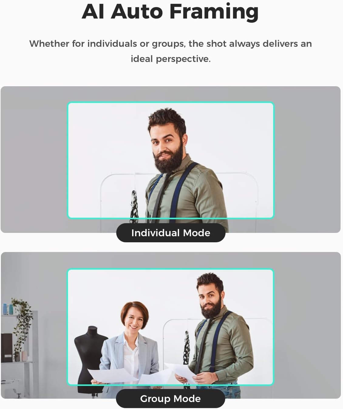 - 【Intelligent AI Framing】Activate our computer camera's group mode and intelligently recognize individuals or groups, optimizing the composition and focus for each frame in real-time. Elevate your group meetings and live streams with ease.