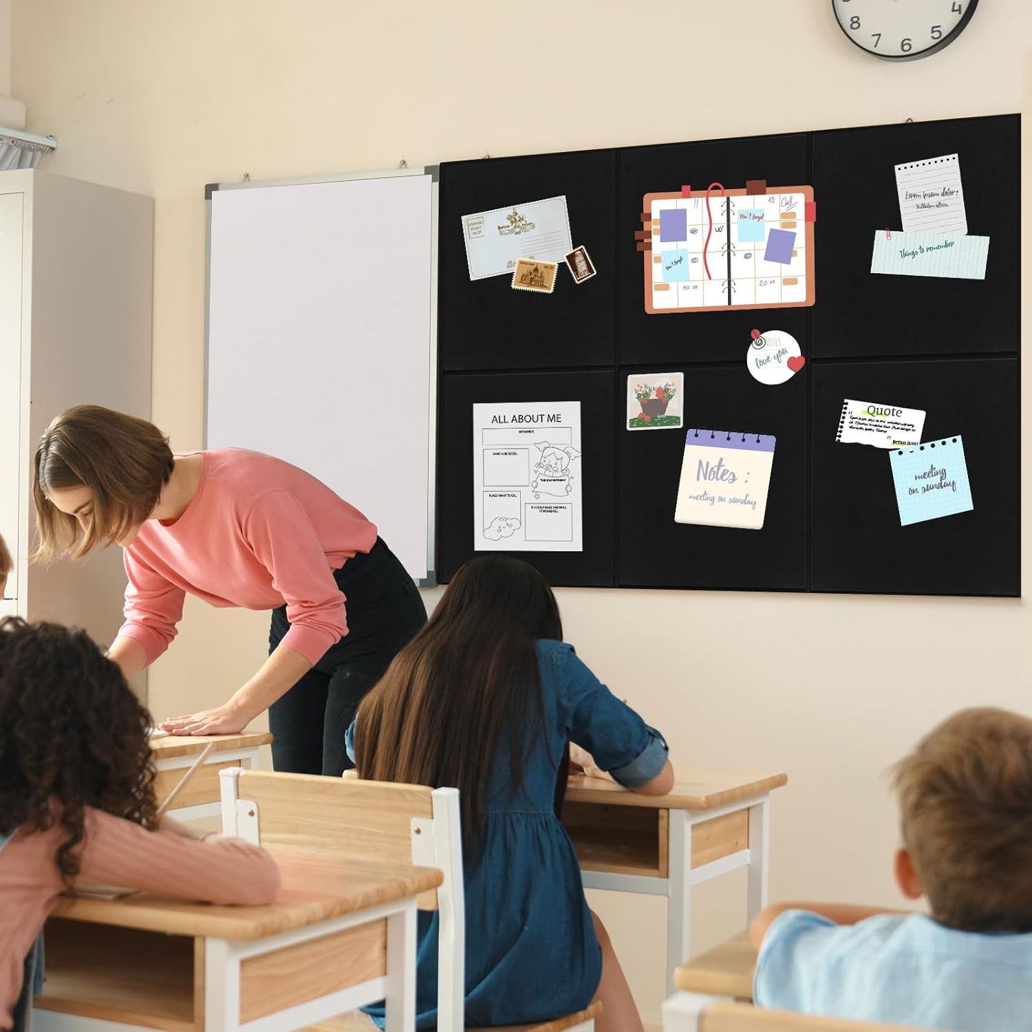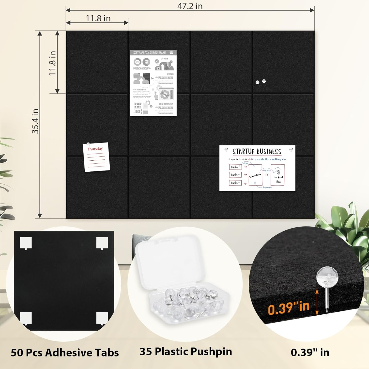 - 【Large Cork Board Set】:Our felt wall tiles includes 12 pieces of 11.8"x11.8"/30x30 cm, 0.35" thick high-density felt pin board, 50 pieces of removable adhesive tabs and 35 push pins that can be customised to any size you need, e.g. 48" x 36", 72" x 48", 96" x 48" etc.