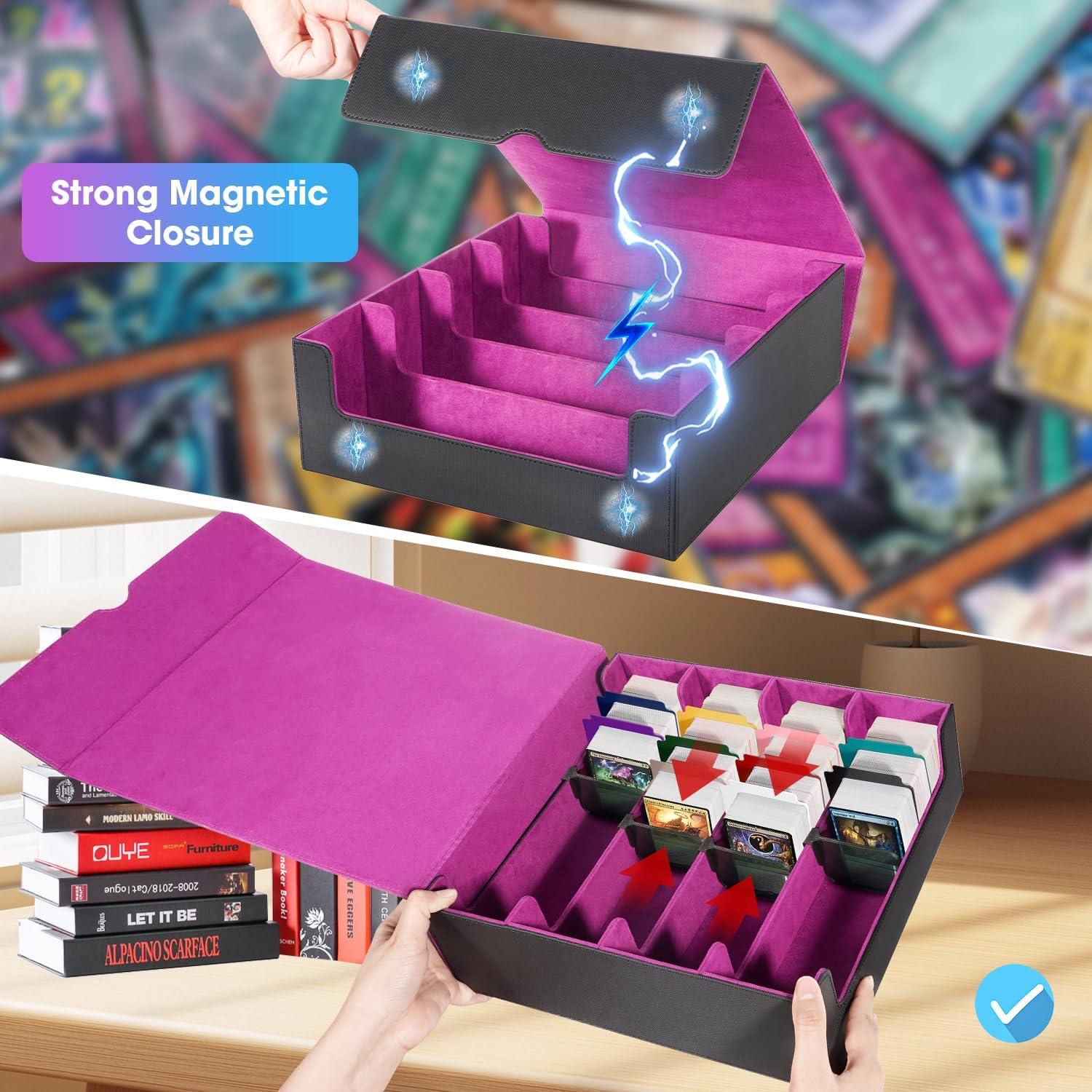 - Strong Magnetic Closure: This card storage box ensures your cards are secure during transport. Even when fully loaded and turned upside down, the magnetic closure design stays tightly closed at all times.