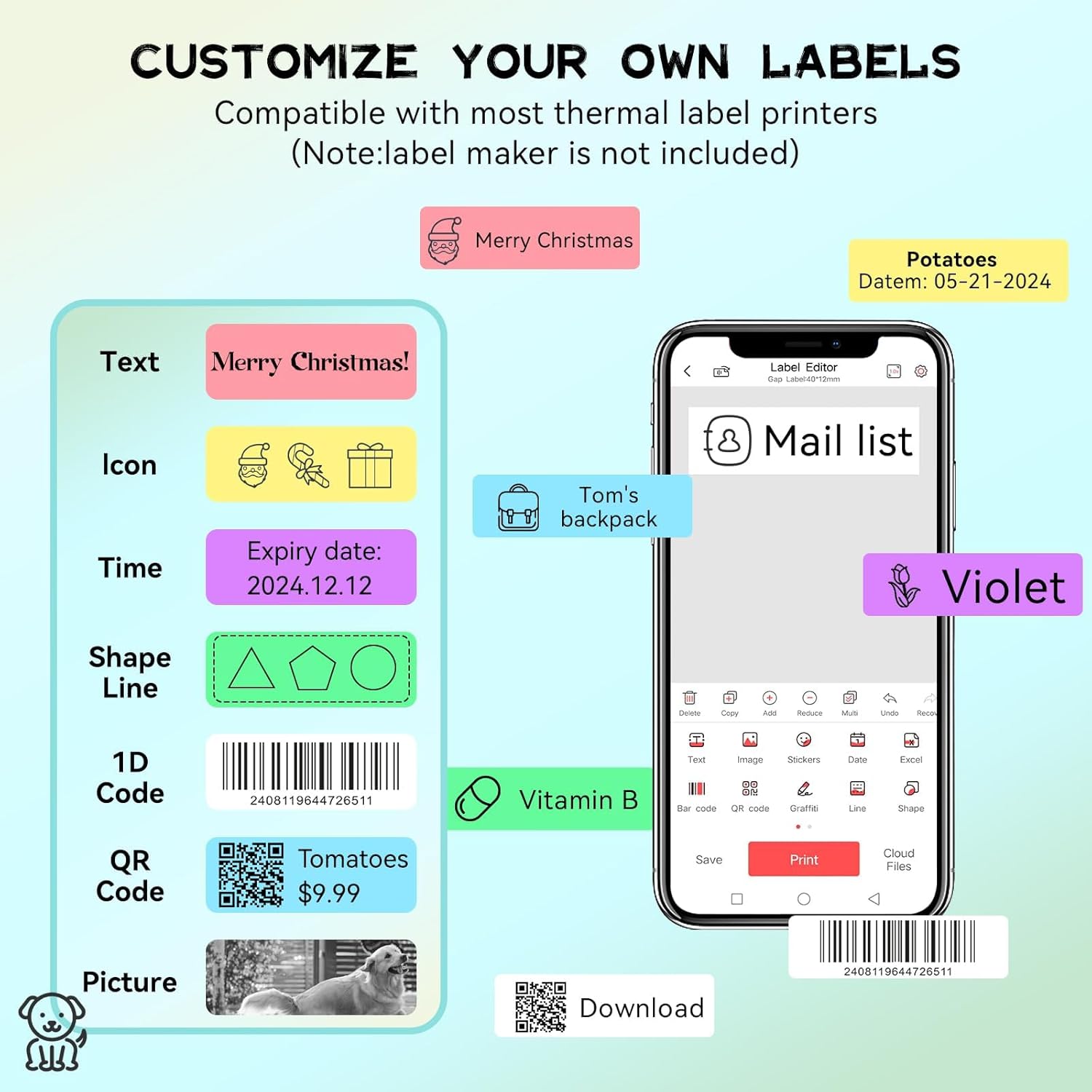 - Label Maker Tape — [Tips:The corners of the labels are square, not rounded]You could get 10 rolls of labels in total, with sizes 15x40mm(0.59x1.57 in), 165 labels/roll, and 1650pcs in total. It is white 5 rolls, blue 1 roll, yellow 1 roll, purple 1 roll, green 1 roll, and pink 1 roll.