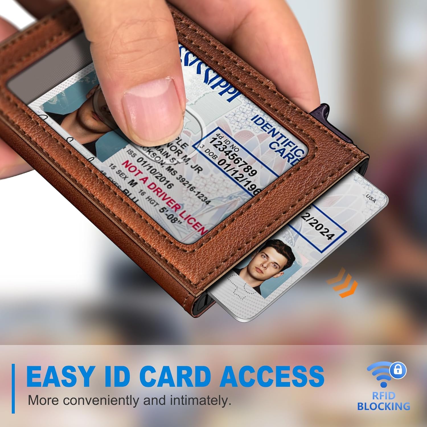 - QUICK POP-UP ACCESS - This minimalist wallet holds to 7-9 cards , metal card holder for 5 cards, easy quick pop-up access. backside 1 ID window, the cash pocket allows you to hold folded bills or 3 Credit cards secure , Ideal for drivers and travelers, offering a sleek and practical design.