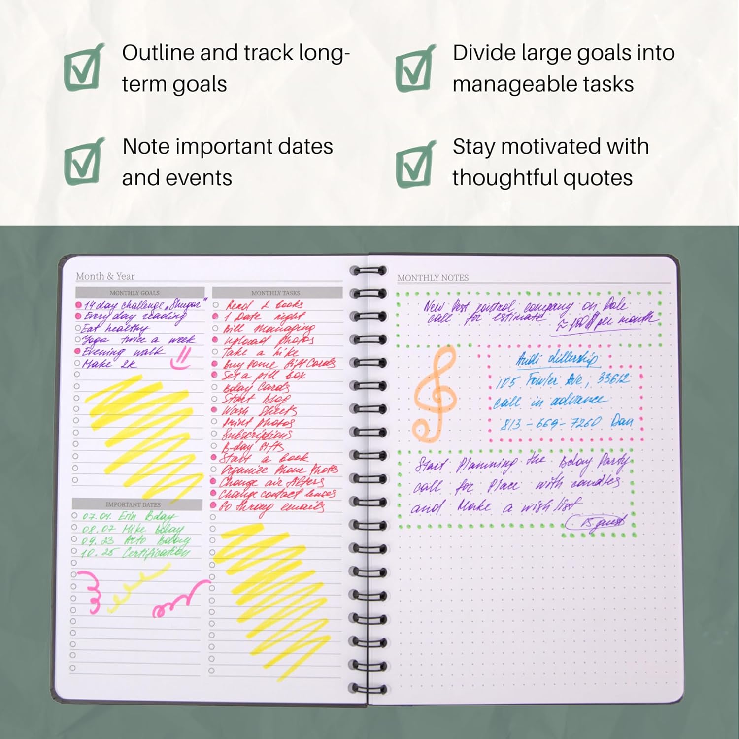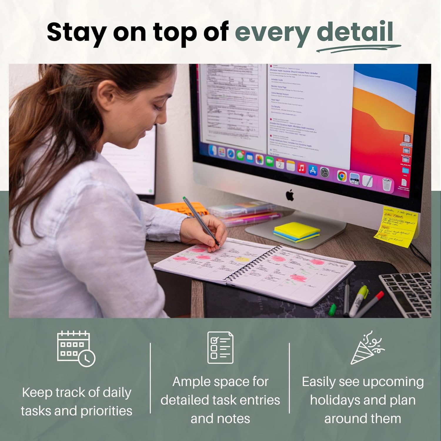 - Thoughtful Features - Designed by avid planners for office workers, students and active moms alike, our calendar + planner has ample room to jot down all of your appointments, birthdays, events, meetings and more. Also equipped with a back pocket to hold notes, shopping lists, pens and more.