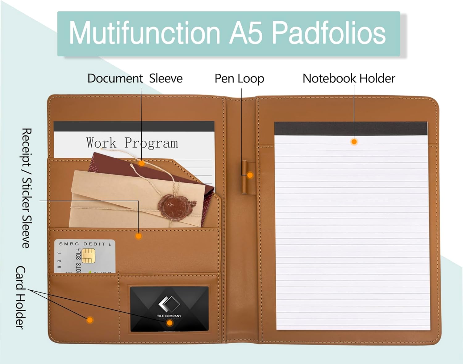 - 【Multifunctional Document Organizer】The leather portfolio is compact, 2 * card pocket/1 * resume and document pouch on the left side, 1 * refillable note pad and pen holder on the right side. With the assistance of mini binder, you can easily organize business paper, letters, notes, envelopes, cards, and other stuff, make your work more efficient.