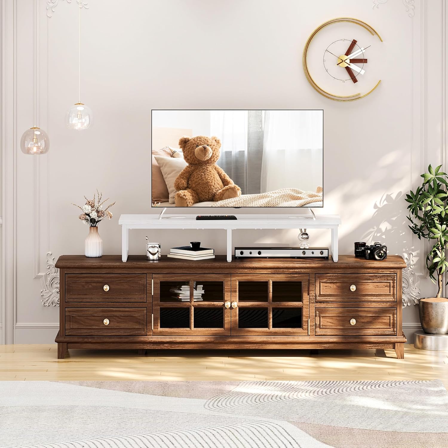 - 【Space Saving】- Raising the TV, the open storage space underneath the TV can be a good place for speakers, controllers, cable boxes, satellite receivers, and game consoles such as PS5, Xbox, and so on. The open space of the tv riser makes it easier to access cables and you don't have to worry about electronic devices overheating.