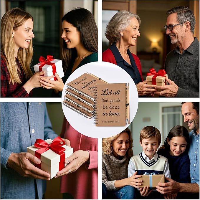 - Scripture Notebook & Pen Set – Includes 5 spiral-bound notebooks and 5 bamboo pens, each featuring a unique Bible verse. Ideal for personal reflection, journaling, or sharing with others.