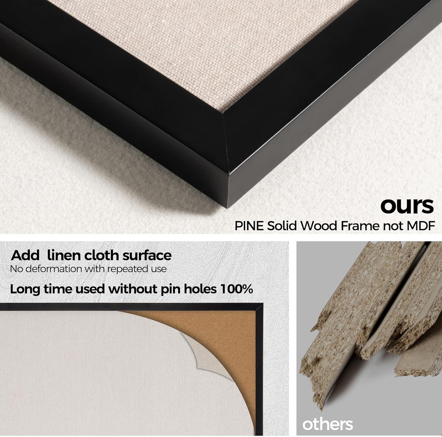 - Pine Frame Material: Our cork boards for walls is made of 100% pine wood which has well self-healing ability and repairability. The pin board features a four-ply splint design that is strong and thick enough not to be punctured by thumbtacks.