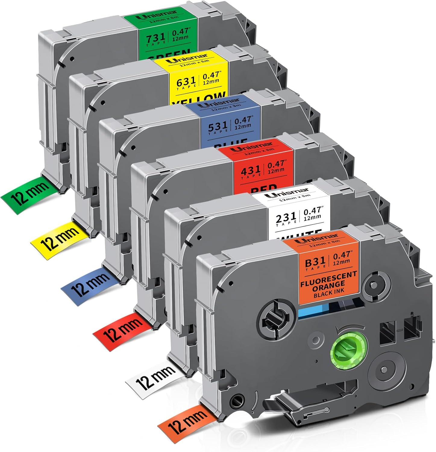 Unismar 6-Pack Compatible for Brother P Touch TZe-231 B31 431 531 631 731 TZe TZ Tape 12mm 0.47 Laminated Flu.Orange/White/Red/Blue/Yellow/Green for Ptouch PT-D220 D210 D400 D410 PTH110 Label Maker