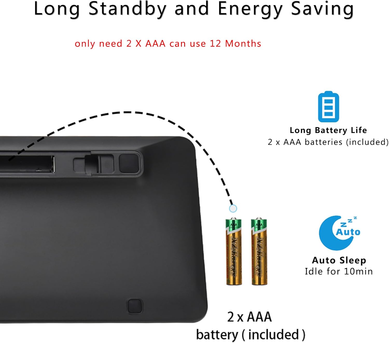 - Long-Lasting Battery: the bluetooth wireless keyboard powered by 2 AAA batteries (included), the keyboard intelligently enters sleep mode after 10 minutes of inactivity. The auto-sleep technology, on/off button(on the back of the keyboard) and the battery indicator light help to save more power,Simply click any key to wake it up in seconds.