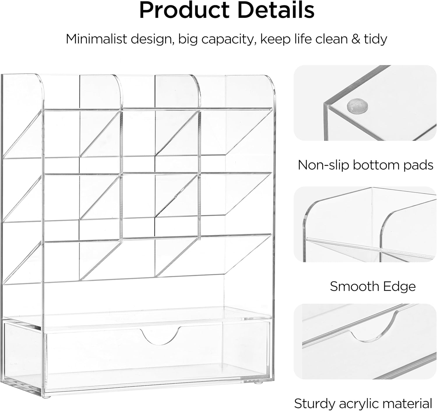 HBlife Acrylic Pen Desk Organizer with Drawer, Clear Vertical Marker Organizer with 11 Compartments, Angled Large Stationary Pencil Display Holder, Art Supplies Organizer for Desk, School and Home